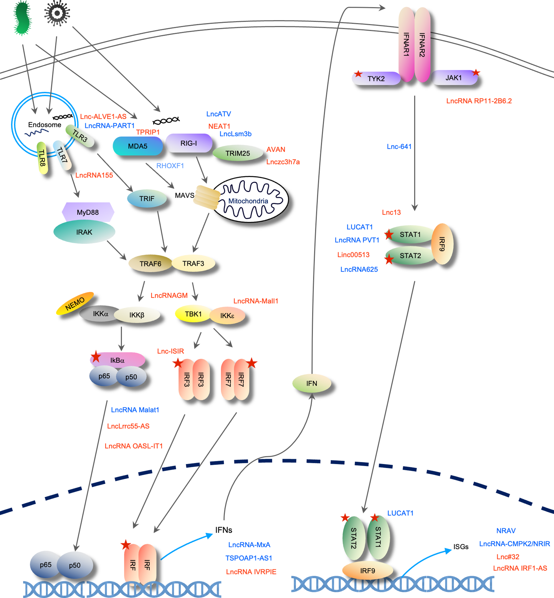 A summary of lncRNAs discussed in this review. From IFN signaling activation to ISG transcription, discussed lncRNAs are positioned at sites of action. Five-sided star represents phosphorylation modification. LncRNA in blue represents negative regulators; lncRNA in red is positive regulators for IFN signaling.