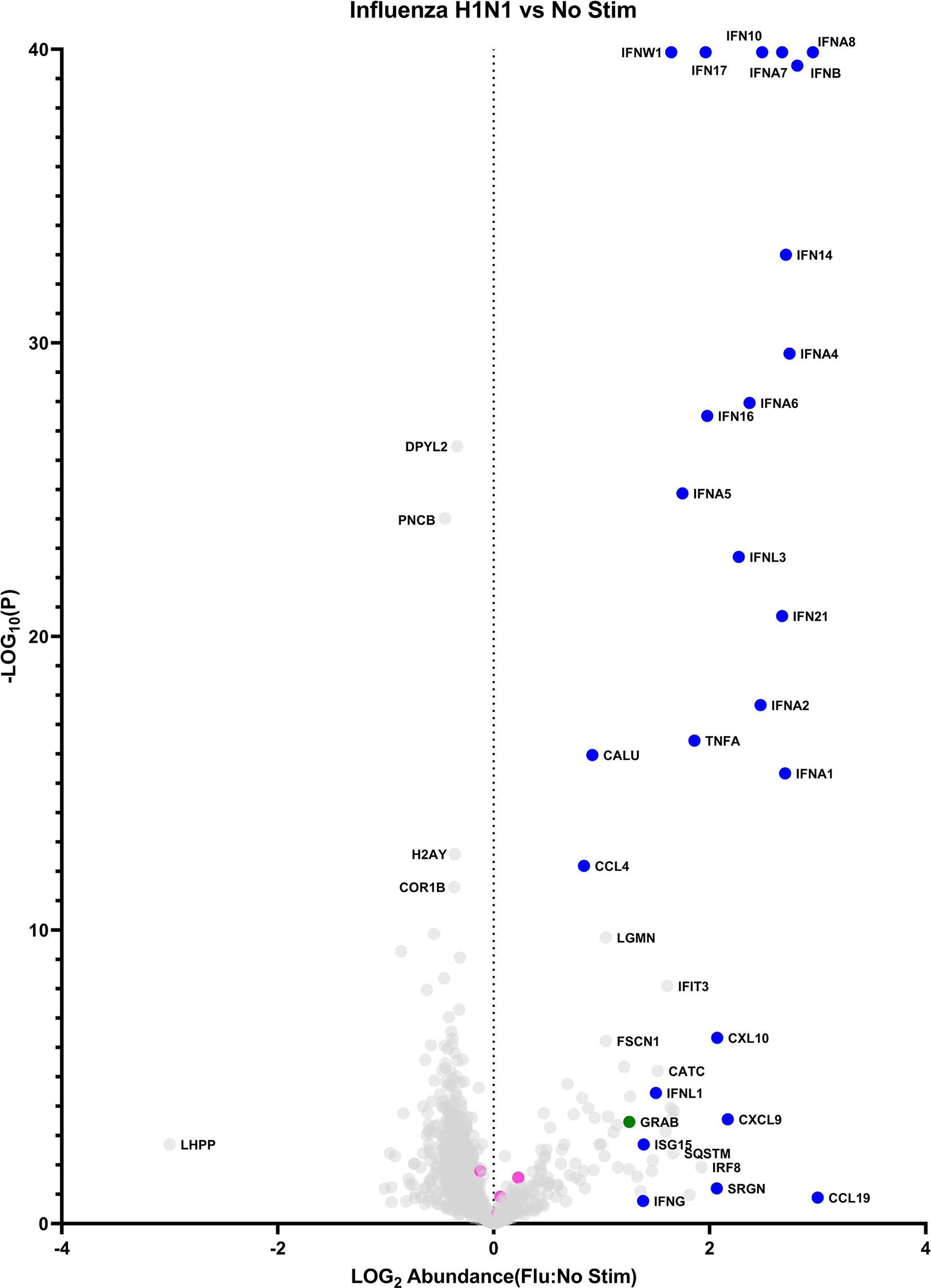 The pDC secretome: baseline vs influenza induced. Data points represent a single protein. Blue: cytokines/chemokines. Pink: exogenous proteins (bovine albumin, porcine trypsin, human transferrin). Green: granzyme B.
