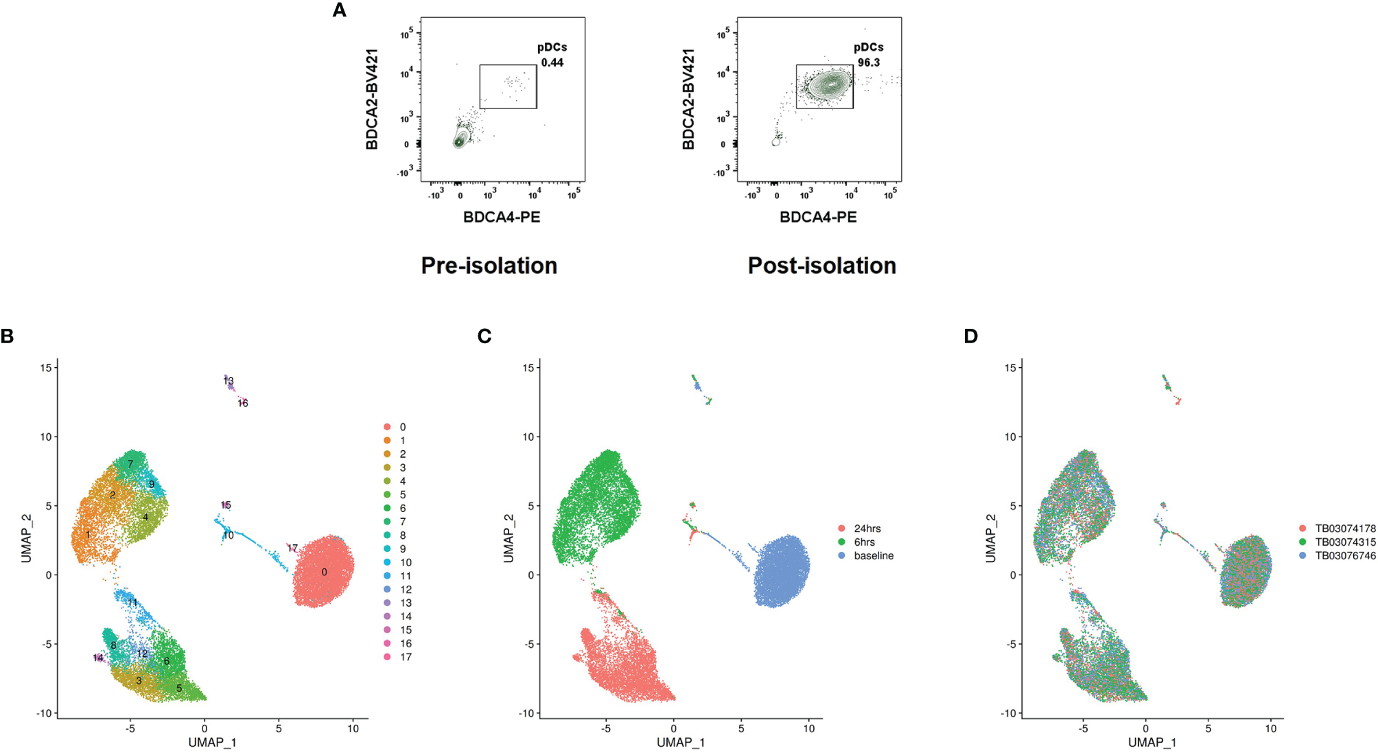 pDC heterogeneity determined by scRNA-seq. (A) Representative pre- and post-pDC isolation purities. Data represent ungated PBMCs stained for the pDC markers BDCA4 and BDCA2. (B) Cell clusters identified by Seurat. (C) Cells colored by time point at partitioning. (D) Cells colored by donor.