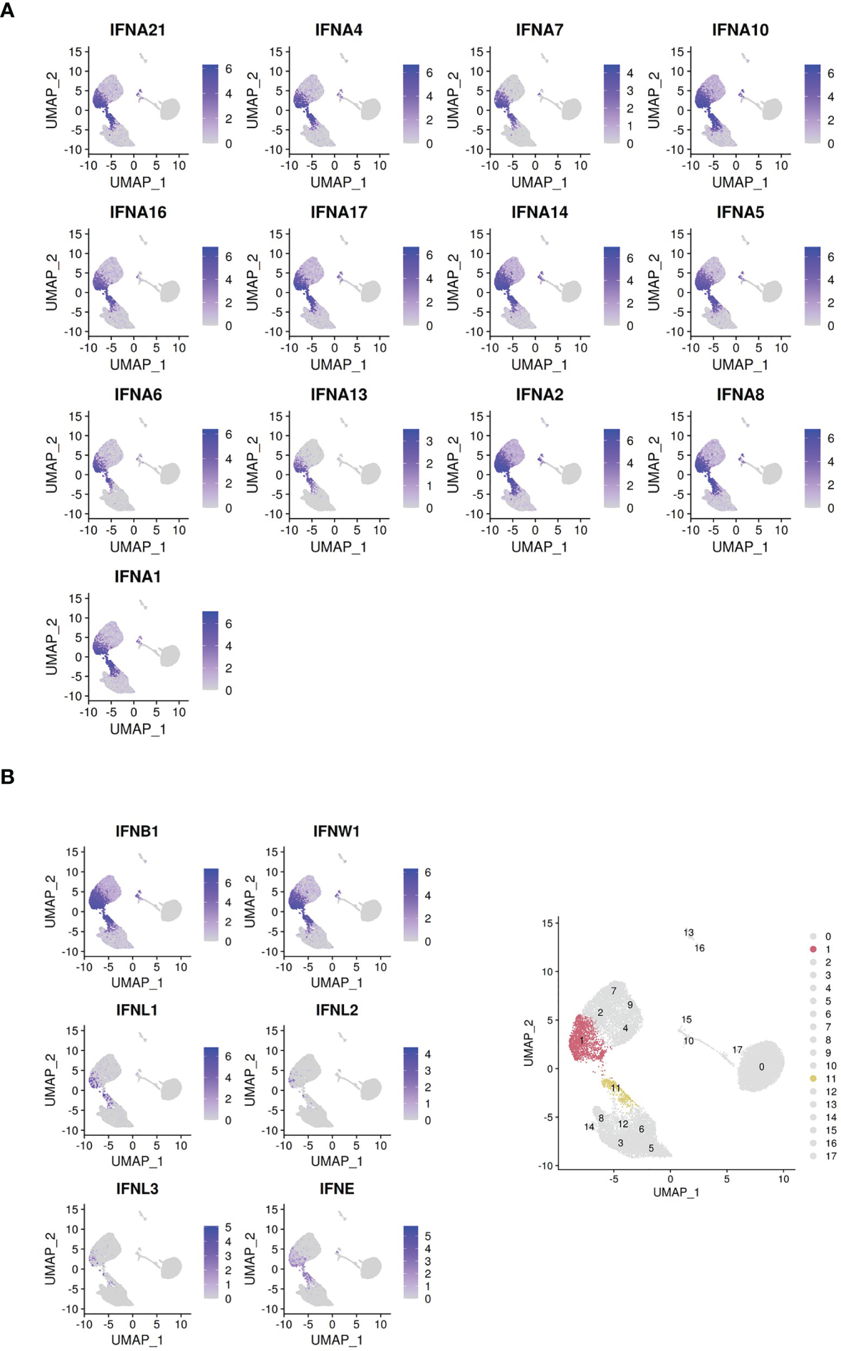 Clusters colored by IFN-I gene expression. (A) Cells colored by IFN-α subtype gene expression. (B) Cells colored by non-IFN-α type I interferon gene expression. Bottom right panel: highlight of clusters 1 and 11 identified by Seurat.