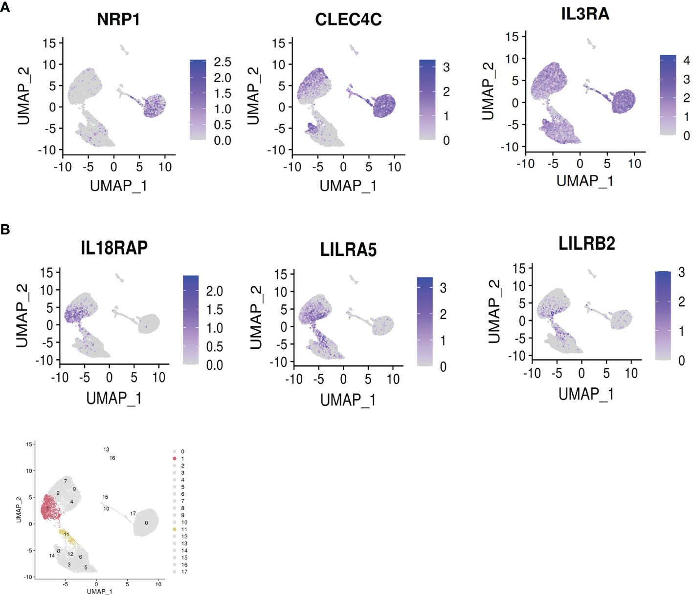 Dropout of classical pDC markers and appearance of novel surface markers on the IFN-α+ cells. (A) Dropout of the classical pDC surface antigens NRP1 [BDCA4], CLEC4C [BDCA2] and IL3RA [CD123] in the IFN-producers. (B) Novel suggested surface markers in the IFN-producers. Bottom panel: highlight of clusters 1 and 11 identified by Seurat.