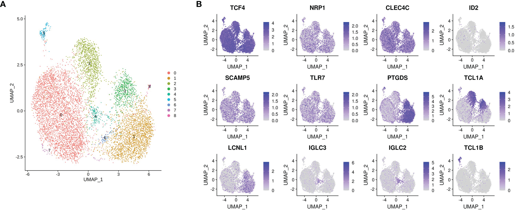 pDC heterogeneity at baseline. (A) Cluster 0 (as identified in Figure 2B) is further divided into 9 subclusters by Seurat, highlighting preexisting pDC heterogeneity as the cells are isolated ex vivo. (B) TCF4, NRP1 and CLEC4C are evenly distributed within these subclusters, as expected. ID2 is absent. pDC enriched genes SCAMP5 and TLR7 are also uniformly expressed, whereas PTGDS, TCL1A, LCLN1, IGLC3, IGLC2 and TCL1B distinguish various subclusters.