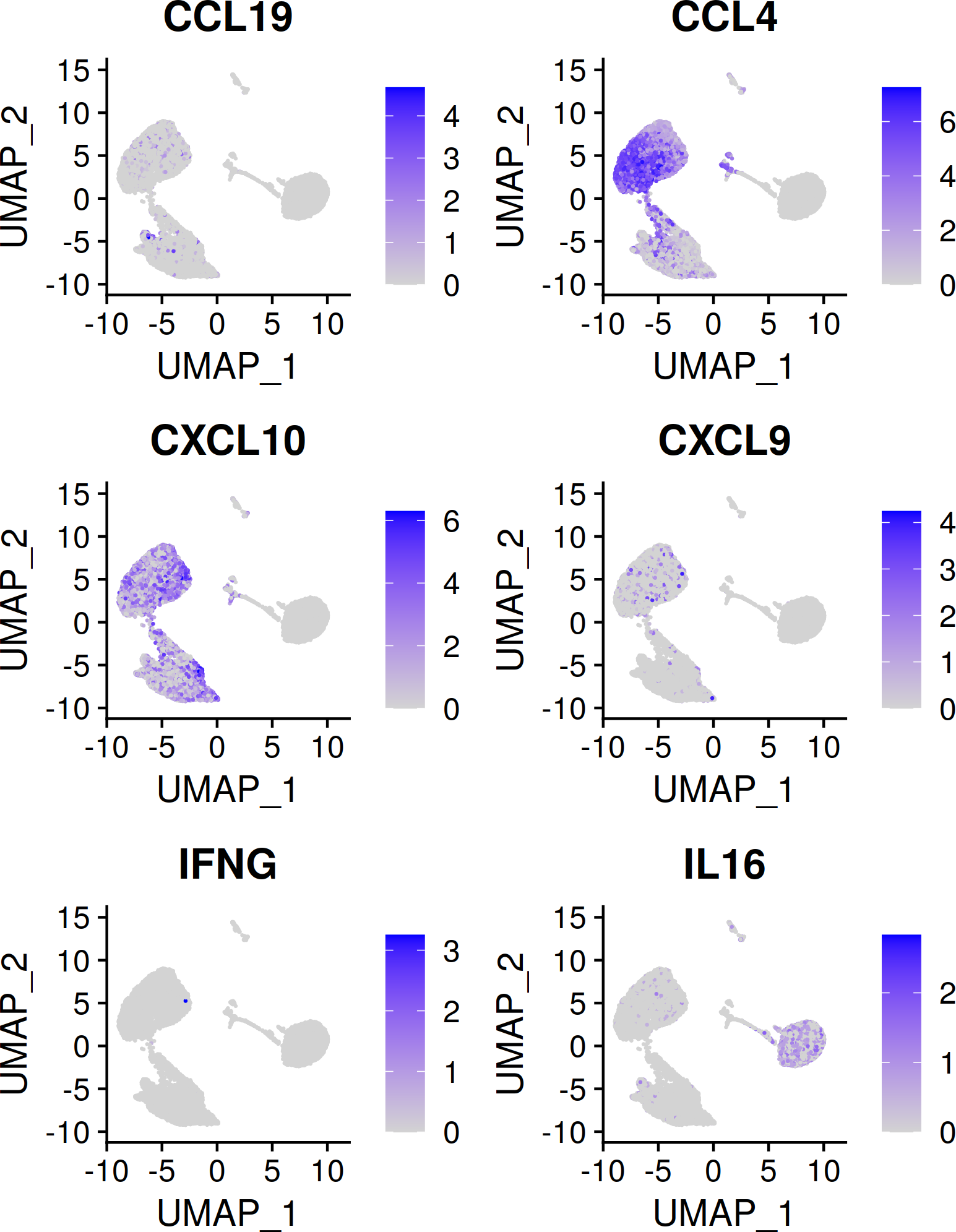 The scRNA-seq data also allow for a more complete understanding of the secretome data discussed previously. As mentioned, pDCs in latter experiments were only ~60% pure, versus near total purity in the scRNA-seq dataset. Many identified cytokines, such as IFN-I and IFN-III, are readily attributable to pDCs. Other identified cytokines and chemokines, such as IL-16, CXCL9, CCL4 and CCL9 may or may not be pDC-derived. As the secretome and scRNA-seq experiments similarly involved pDC stimulation with influenza virus over a course of 24hrs, the scRNA-seq data may be leveraged to determine whether pDCs are in fact contributing the identified proteins in the secretome dataset. As shown in Figure 7, IL-16, CCL4 and CXCL10 are confirmed to be pDC-derived, whereas IFNG is confirmed to come from non-pDCs. Interestingly, IL16 is expressed predominantly among cells of the ex vivo time point, and is lost upon stimulation, confirming its status as a member of the ‘baseline’ pDC secretome discussed above.