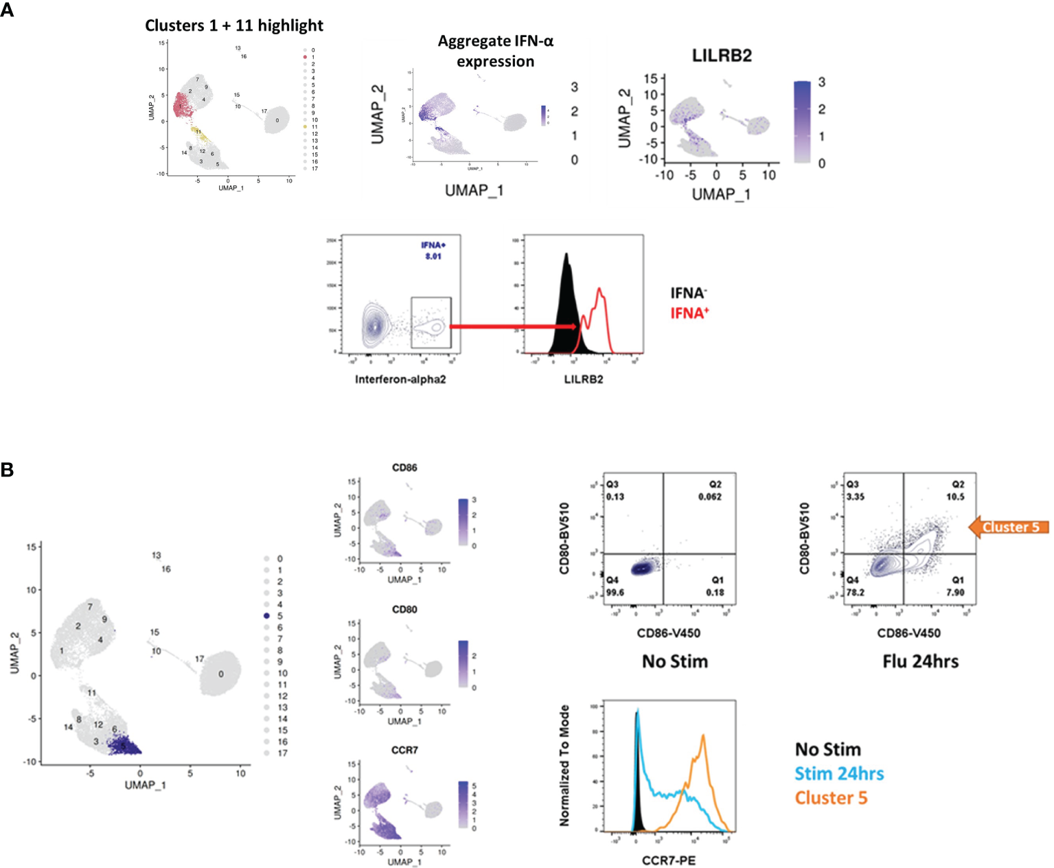 Validation of surface markers suggested by scRNA-seq. (A) pDCs in the IFN-α+ cluster lose canonical pDC markers and adopt new ones (see also, Figure 4), including IL18RAP, LILRA5 and LILRB2. Upon stimulation with influenza virus, the population of IFN-α+ cells stains positive for LILRB2 whereas IFN-α- cells are negative for LILRB2. (B) Cluster 5 is notable for the adoption of a cDC like state, including upregulation of ID2 (Figure 5), CD80, CD86 and CCR7. Stimulation of pDCs with influenza virus produces a population of cells which stain for CD80 and CD86, these cells also upregulate expression of CCR7 at the protein level as determined by flow cytometry.
