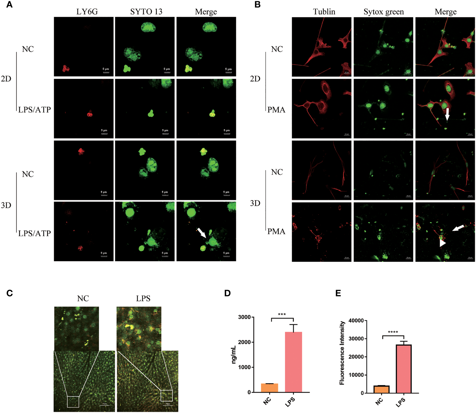 We tested the production of NETs by human peripheral blood Neu when co-cultured with mucosal epithelial cells lines NCM460. Neu produced fuller NETs when stimulated by LPS/ATP (Figure 5A, white arrow, Supplementary Video 1). At the same time, we showed that 2D cultured cells adhered and grew on a flat surface, while 3D cultured cells contact with other cells in three-dimensional space (Supplementary Figure 4A, white arrow, Supplementary Video 2).