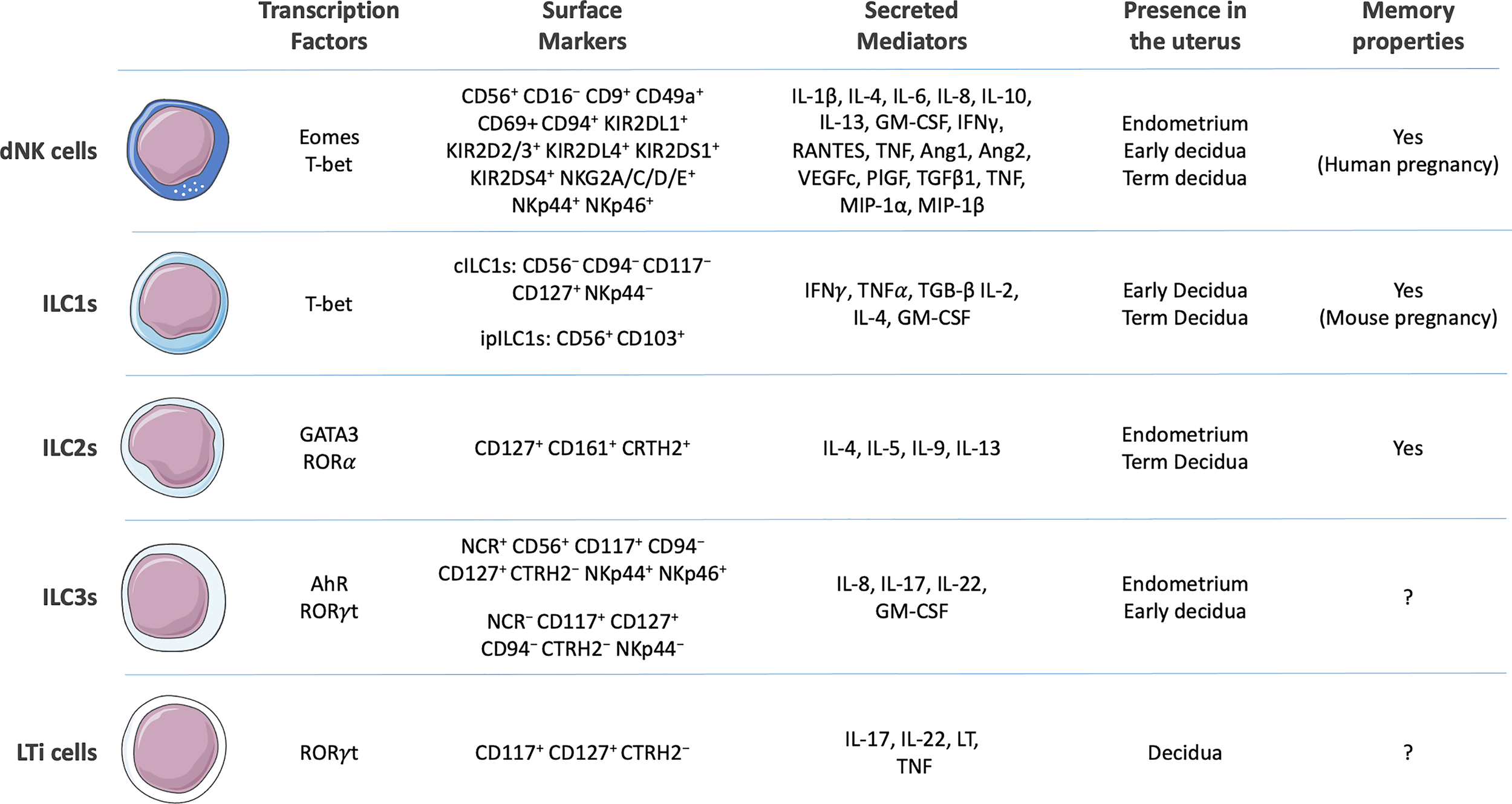 Surface markers, secreted cytokines, presence in the uterine environment, and capacity to develop memory of human decidual Natural Killer (dNK) cells (12–14) and generic human innate lymphoid cells (ILCs) 1 [conventional ILC1s (cILC1s) and intraepithelial (ipILC1s)], ILC2s, ILC3s, and lymphoid tissue inducer (LTi) cells (11, 15–17). Composed with images from: Smart Servier Medical Art (smart.servier.com).