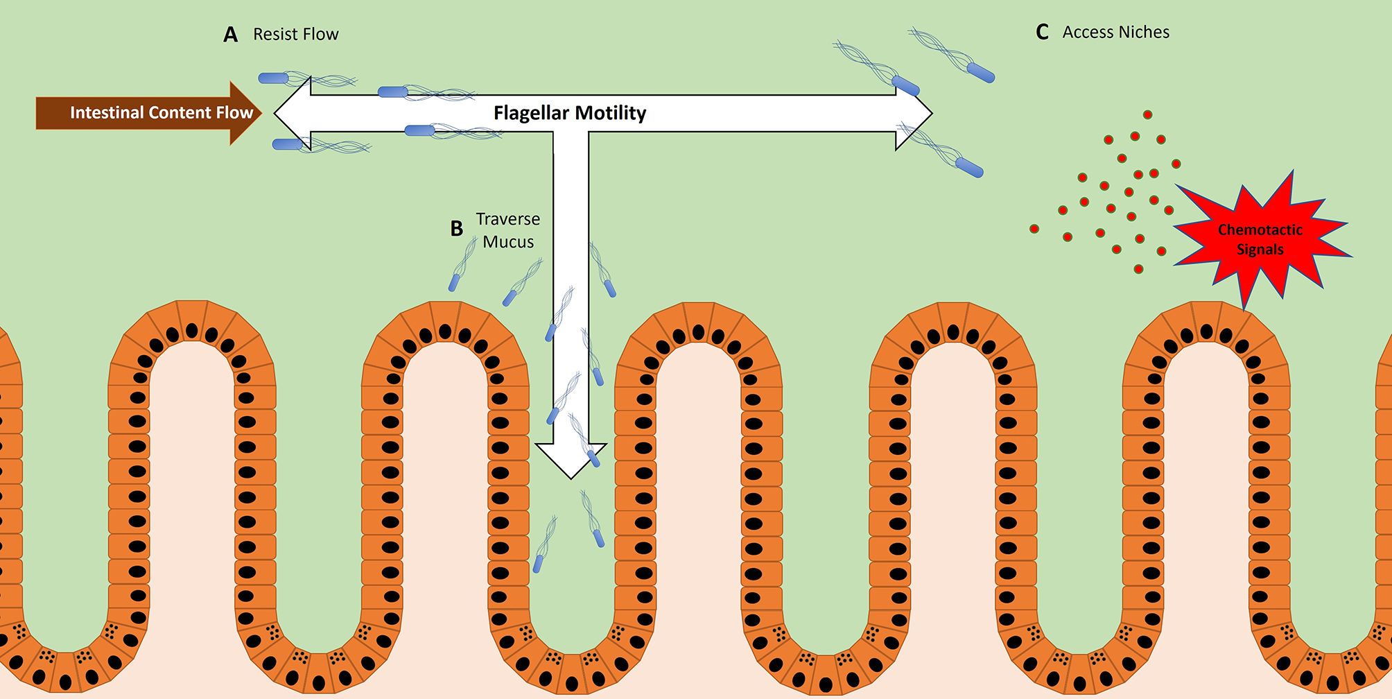 Given that microbes often optimize their metabolism to specific nutrient niches, it is important for these microbes to localize to the favorable regions of the host gastrointestinal tract (56). However, the proximal-distal peristaltic flow of intestinal contents, as well as the rapid turnover and shedding of mucus and epithelial cells, impose a perpetual existential threat to microbes attempting to maintain colonization (51, 52, 57). To overcome these challenges, some commensal and non-commensal bacteria use flagellar motility to stably colonize specific regions of the GI tract (57, 58).