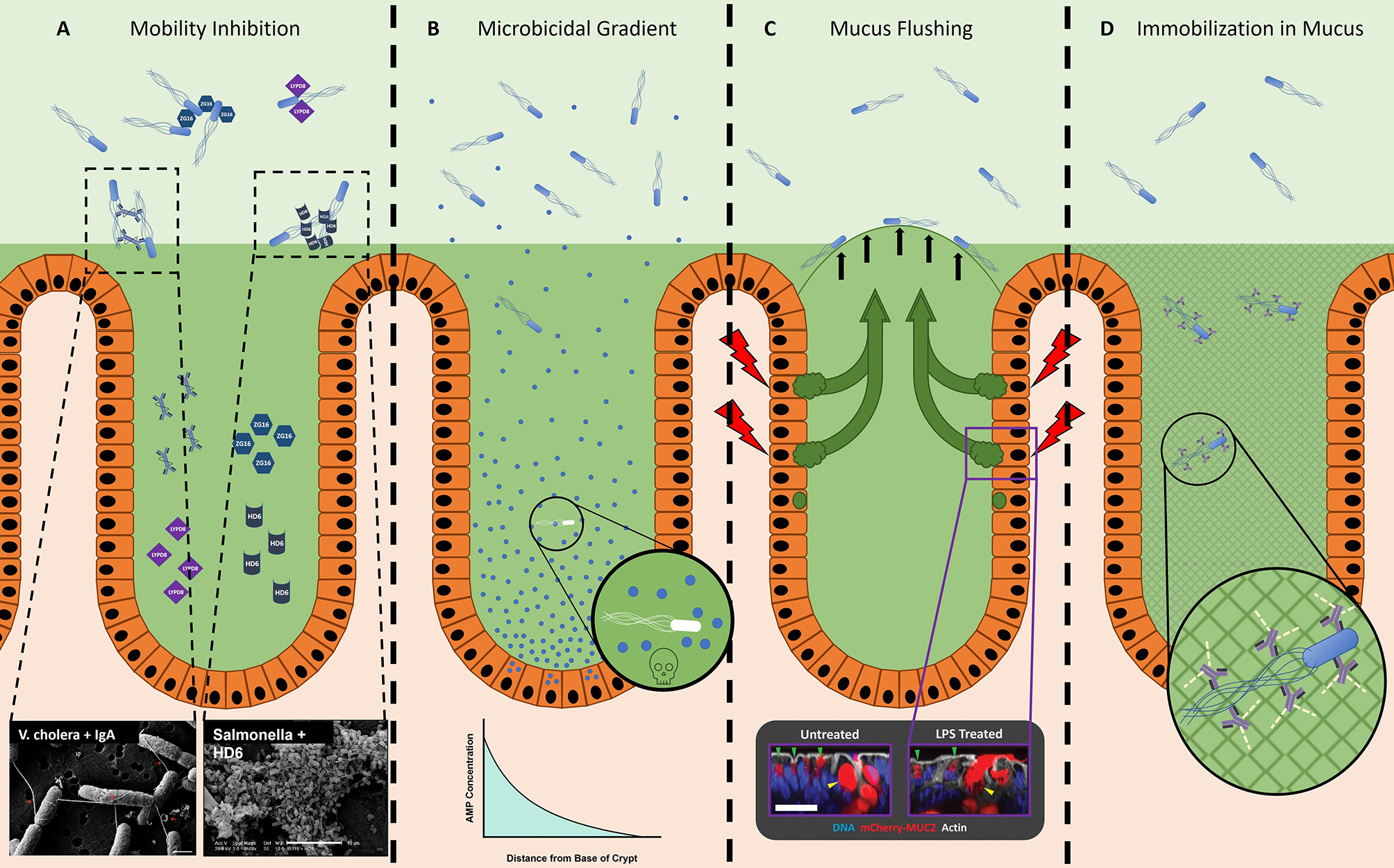 In addition to the repertoire of effector proteins that function via mechanisms of motility inhibition, bactericidal peptides and proteins produced in the GI tract also contribute to the maintenance of spatial segregation. At the base of small intestinal crypts, secretory Paneth cells constitutively secrete antimicrobial peptides and proteins (AMPs) into the lumen, creating a concentration gradient with highest concentrations at the base adjacent to the intestinal stem cells (95) (Figure 2B). Consequently, luminal bacteria entering the crypt would initially be exposed to mucus harboring a lower concentration of AMPs, and as such, subjected to less bactericidal activity; however, bacteria able to swim into the crypt would be exposed to elevated concentrations of AMPs, a more inhospitable (and potentially lethal) environment (95, 108). In support of this model, Paneth cell ablation does not result in microbial overgrowth in the lumen as one might initially expect, but instead results in increased rates of bacterial translocation likely due to a more permissive environment near the epithelium and crypt (109). Therefore, the minefield of AMPs produced by Paneth cells may provide an “incentive” to stay out of the crypt, and instead remain distant from the epithelial surface.