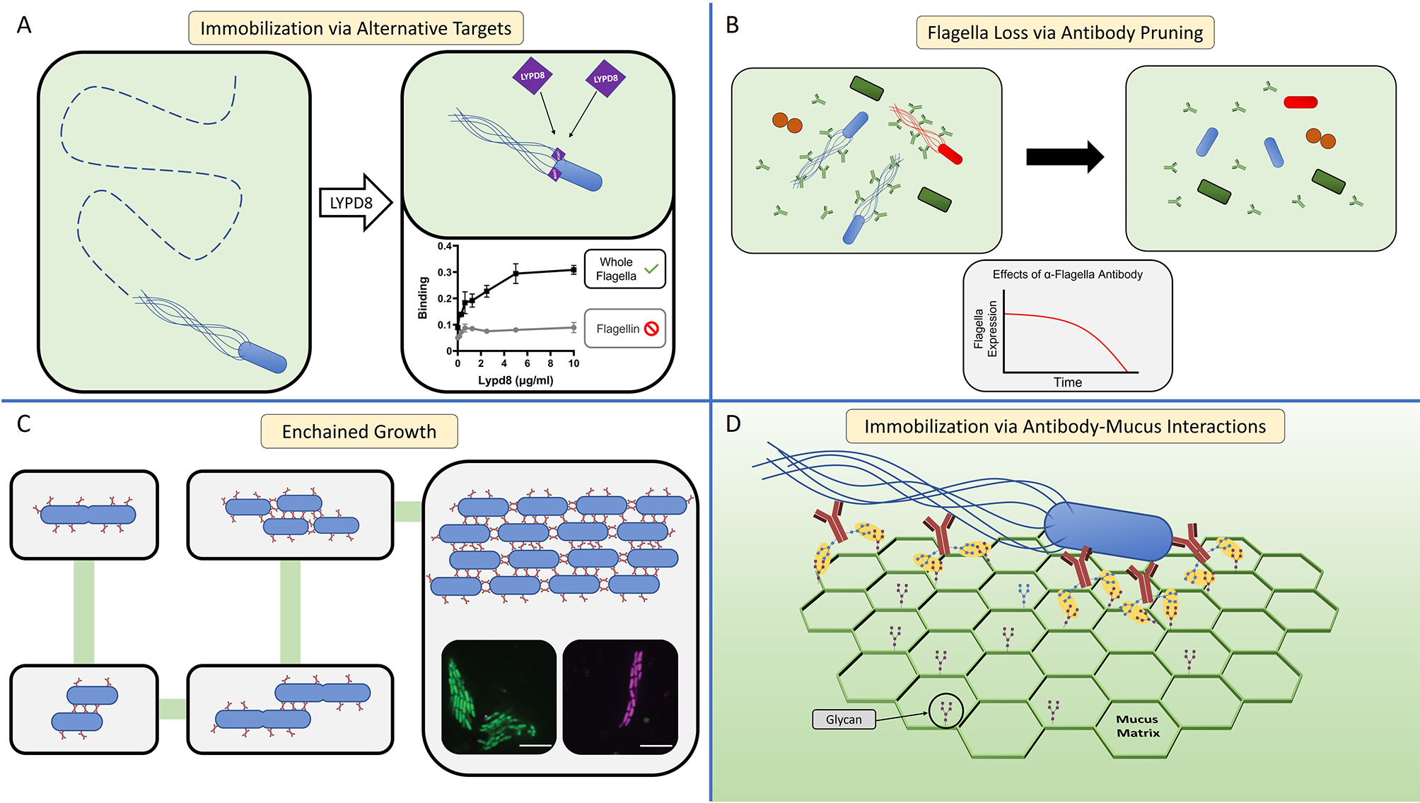 The host immune system can inhibit bacterial motility through multiple mechanisms. (A) Host effector molecules can inhibit flagellar motility through non-agglutination means by binding sites on the flagellum other than flagellin. LYPD8 (purple diamond) inhibits the flagellar motility of STM by binding to the flagellum (89). Graphs display ELISA experiments showing that LYPD8 binds the flagella (right), but does not specifically target flagellin (left) [adapted from (89)]. LYPD8, Ly6/Plaur Domain Containing 8. (B) The host can influence the microbiota’s expression of flagellar genes through antibody-mediated pruning (74, 107). A sizable fraction of antibody (green bifurcating structures) in the GI tract bind can bind to the flagella of commensal microbes (left panel), resulting in a significant decrease of flagellated bacteria within the microbiota (right panel). While this antibody-mediated pruning results in a decrease of flagella expression within the microbiota, the overall composition of the microbiota remains largely unchanged. In vitro experiments show that the anti-flagellin antibody causes E. coli to down regulate its expression of flagellin over time (graph). (C) In the GI tract, antibody-mediated agglutination can occur through a process termed enchained growth (62, 94). By this mechanism, bacteria that are actively dividing within the GI tract are coated in antibody (red line structures). Upon successful fission, the daughter cell is immediately linked to the mother cell from antibody crosslinking. Over multiple cycles of division, an agglutinated aggregate is formed consisting of clonal population of bacteria. Fluorescence microscopy micrographs depict examples of these clonal agglutinated aggregates (inset micrographs). (D) Antibody-mucin interactions facilitate the immobilization of motile bacteria within the mucus matrix (green hexagonal structure). In this model, glycans present on the surface of antibody (brown bifurcating structures) and mucin form weak, non-covalent interactions (yellow ovals) (96, 97). When motile bacteria within the mucus are coated by antibody, the numerous antibody-mucus interactions create a cumulatively strong non-covalent interaction that immobilizes the bacteria.