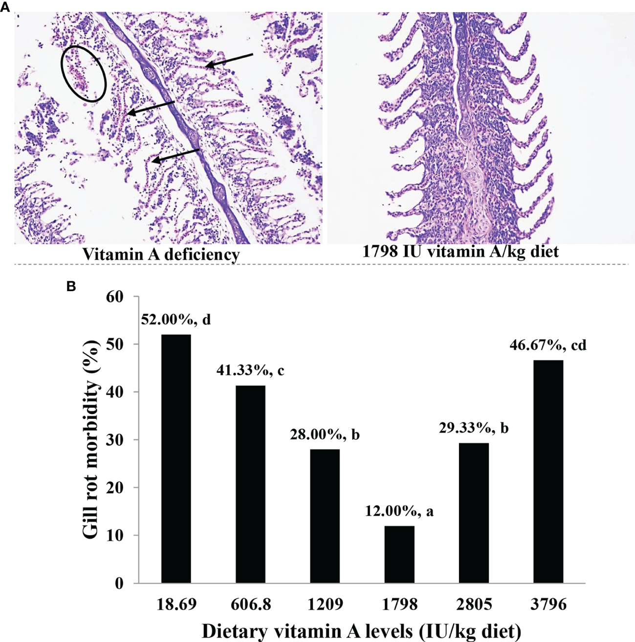 As shown in Figure 1, when the dietary vitamin A level reached 1,798 IU/kg diet, the prevalence of gill rot was significantly found to be reduced to the minimum (12%) (P < 0.05). At the same time, the pathophysiological inspections indicated that vitamin A deficiency caused significant capillary hematoma and gill damage of fish infected by F. columnare.