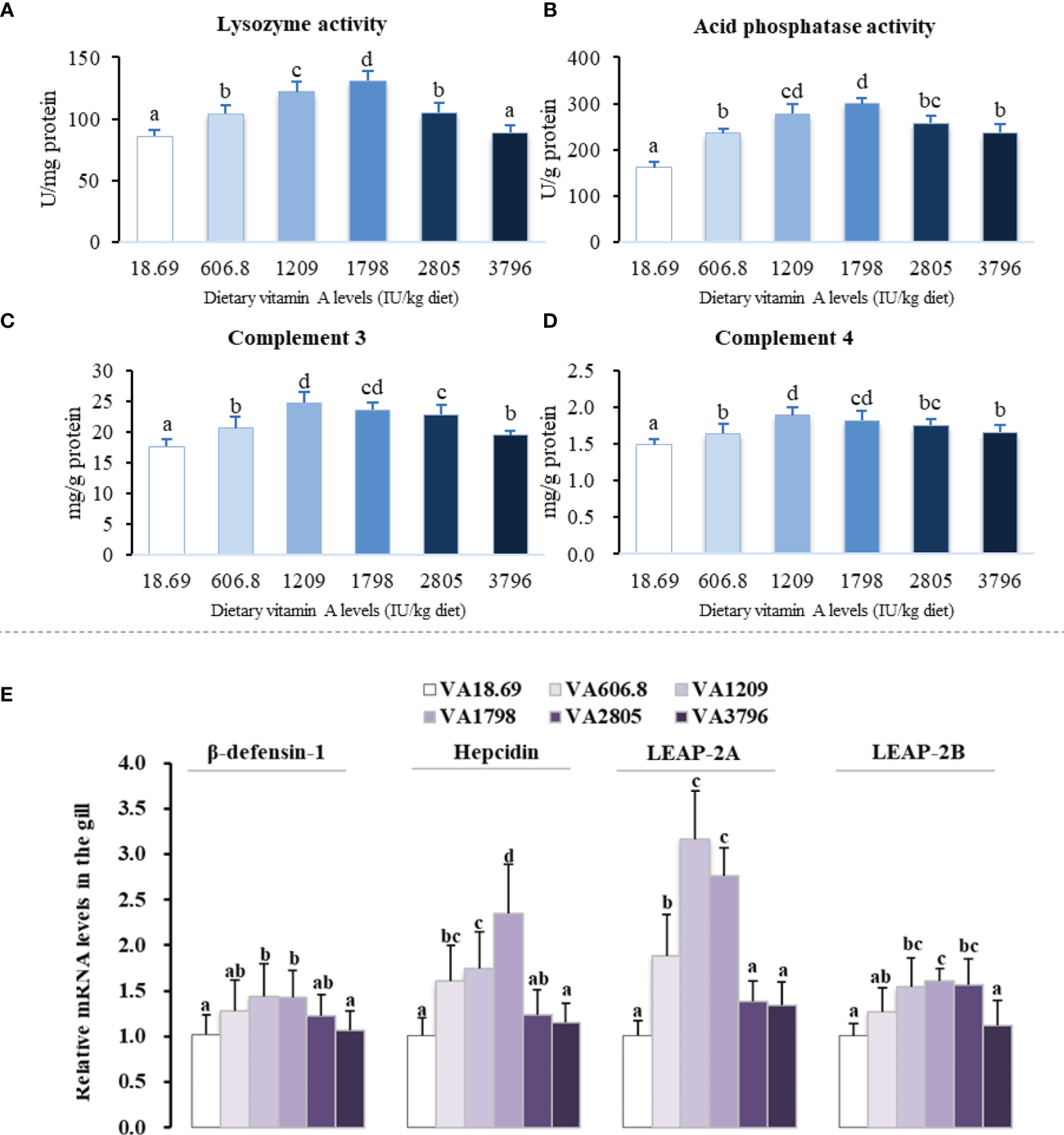 Antibacterial compound activity or contents (A–D) and relative mRNAs of antibacterial peptides (E) in the gill of on-growing grass carp fed diets containing various vitamin A levels for 10 weeks, which were then infected by F. columnare. The values shown are means (n = 6); error bars indicate SD. Different letters indicate the significant differences (P < 0.05). β-actin was used as an internal control gene. LEAP, liver-expressed antimicrobial peptide.