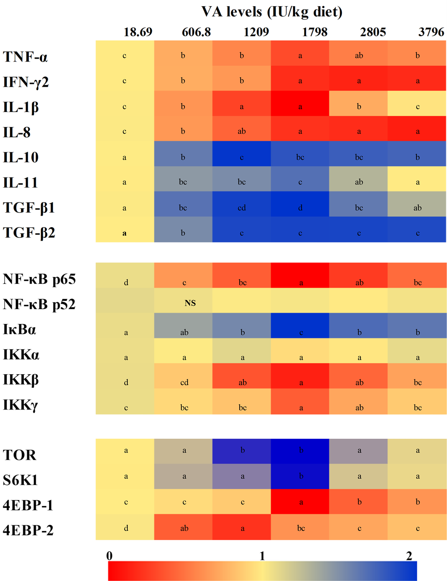 Heatmap for the expression of relative mRNAs of different cytokines and related signaling factors in the gill of on-growing grass carp fed diets containing various vitamin A levels for 10 weeks, which were then infected with F. columnare. The values shown are means (n = 6). The different letters indicate the significant differences (P < 0.05). β-actin was used as an internal control gene. TNF-α, tumor necrosis factor α; IFN-γ2, interferon γ2; IL, interleukin; TGF, transforming growth factor; NF-κB, nuclear factor κB; IκB, inhibitor κB; IKK, IκB kinase; TOR, target of rapamycin; S6K1, S6 kinase 1; 4EBP, eukaryotic translation initiation factor 4E-binding protein. NS, not significant difference.
