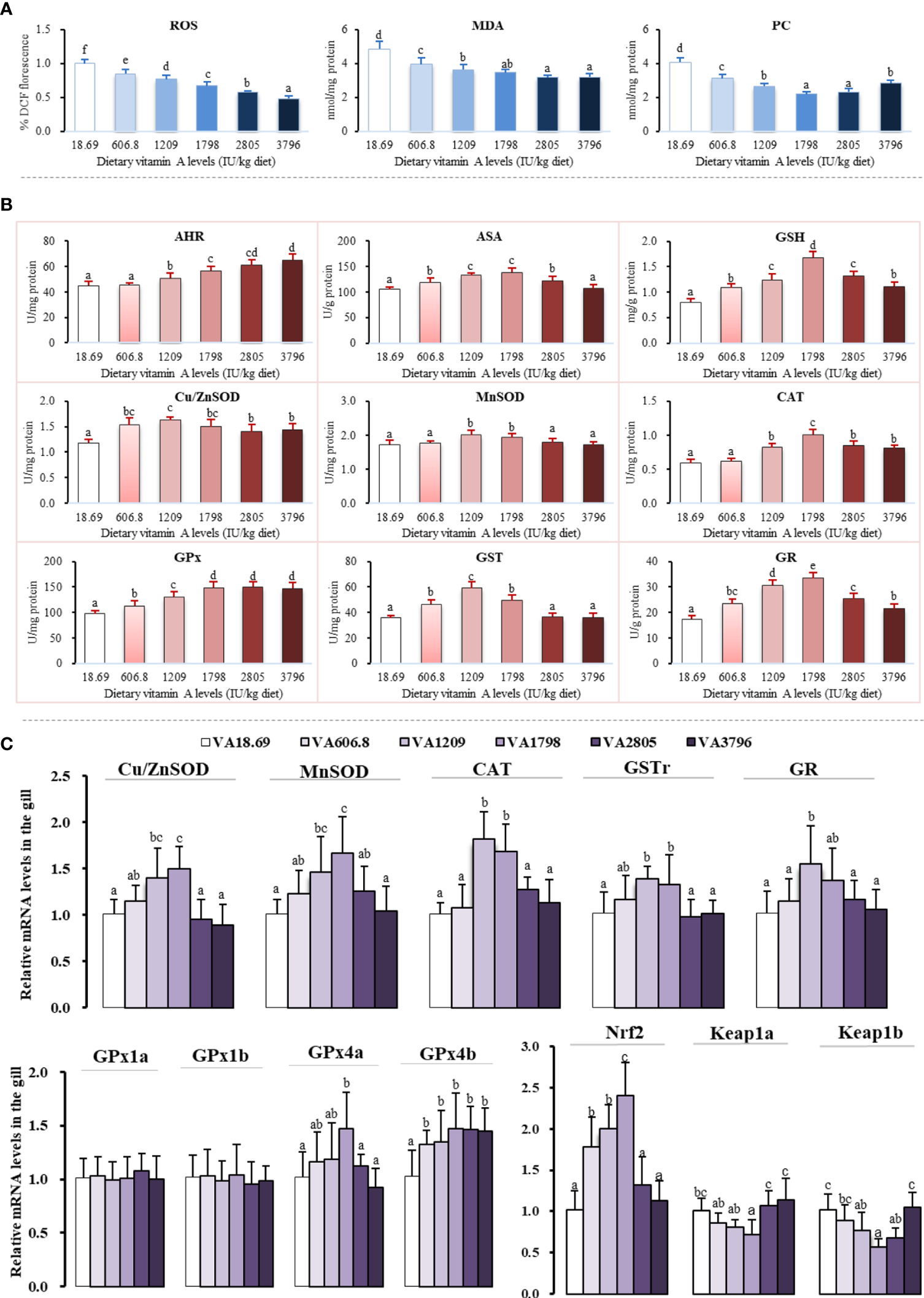 Potential effects of dietary vitamin A on oxidative damage (A), antioxidant enzyme activities (B), and relative expression of mRNAs of antioxidants and related signaling factors (C) in the gill of fish. The values shown are the means (n = 6); error bars indicate SD. The different letters indicate the significant difference (P < 0.05). β-actin was used as an internal control gene. ROS, reactive oxygen species; MDA, malondialdehyde; PC, protein carbonyl; AHR, anti-hydroxy radical; ASA, anti-superoxide anion; Cu/ZnSOD, copper/zinc superoxide dismutase; MnSOD, manganese superoxide dismutase; CAT, catalase; GPx, glutathione peroxidase; GST, glutathione-S-transferase; GR, glutathione reductase; GSH, glutathione.