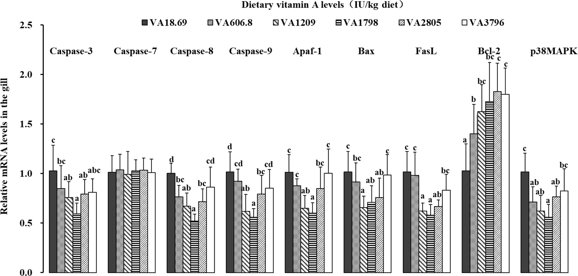 Relative expression of mRNAs of apoptosis-related factors in the gill of fish fed diets containing various vitamin A levels for 10 weeks, which were then infected by F. columnare. The values shown are the means (n = 6); error bars indicate SD. The different letters indicate the significant difference (P < 0.05). β-actin was used as an internal control gene. Apaf-1, apoptotic protease-activating factor 1; Bax, B-cell lymphoma protein 2-associated X protein; FasL, Fas ligand; Bcl-2, B-cell leukemia/lymphoma-2; p38MAPK, p38 mitogen-activated protein kinase.