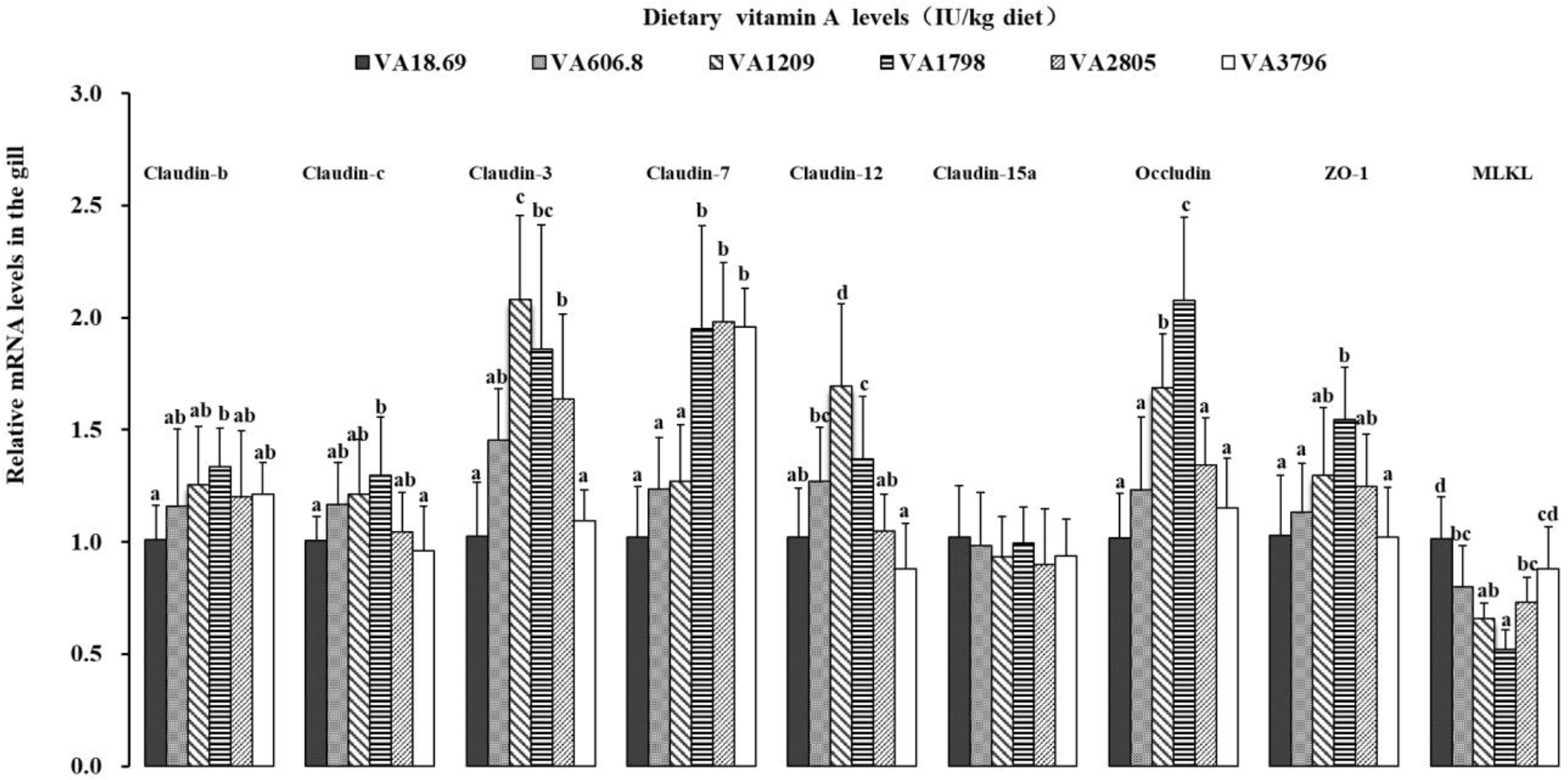 Relative expression of mRNAs of the tight junction-related factors in the gill of on-growing grass carp fed diets containing various vitamin A levels for 10 weeks, which were then infected by F. columnare. The values shown are the means (n = 6); error bars indicate SD. β-actin was used as an internal control gene. Different letters indicate the significant difference (P < 0.05). ZO-1, zonula occludens-1; MLCK, myosin light chain kinase.