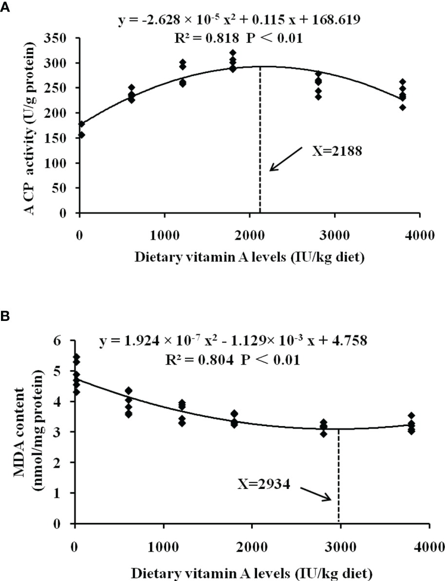 Quadratic regression analysis of MDA content (A) and ACP activities (B) for grass carp fed diets containing various vitamin A levels for 10 weeks. MDA, malondialdehyde; ACP, acid phosphatase.
