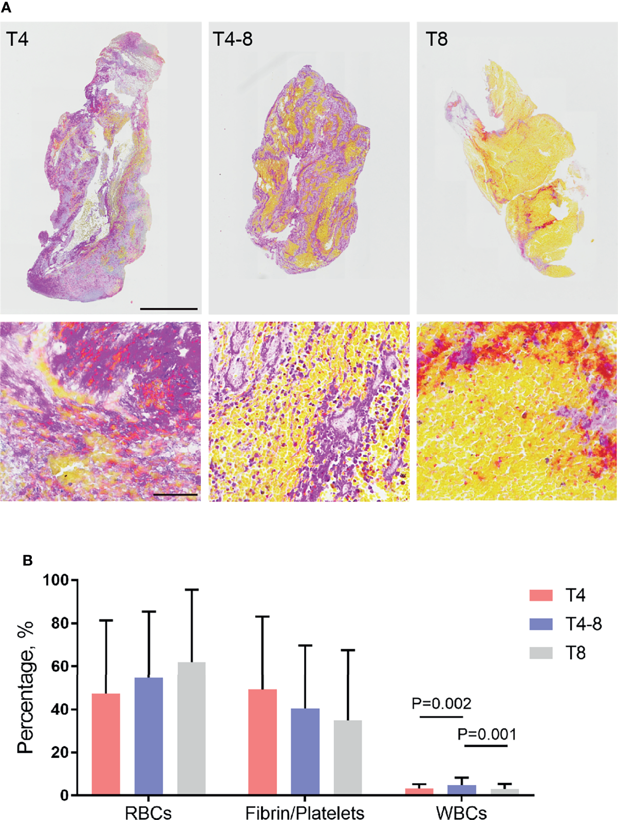 Red blood cells (RBCs), fibrin/platelets, and white blood cells (WBCs) in thrombi in relation to the different durations of time to reperfusion. (A) Representative image of thrombi sections comparing <4 h (T4), 4–8 h (T4–8), and >8 h (T8) time to reperfusion. Martius Scarlett Blue staining was used to detect RBCs (yellow), fibrin/platelets (red or purple), and WBCs (blue). Low-magnification scale bar = 1 mm; high-magnification scale bar = 60 μm. (B) Box plot indicating thrombus composition changes with different times to reperfusion. The percentage of each component (RBCs, fibrin/platelets, and WBCs) relative to the whole thrombus was calculated.