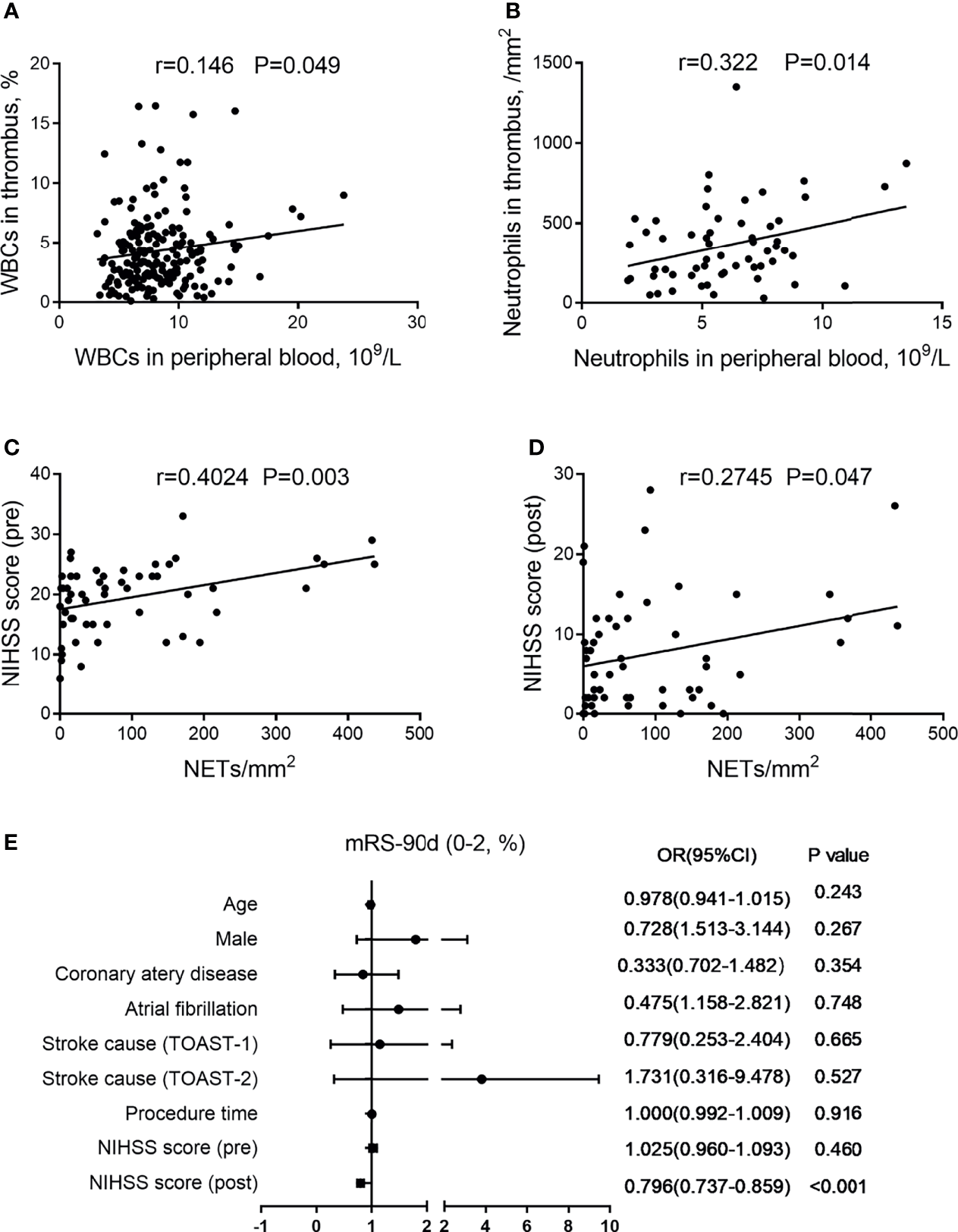 Association of (neutrophil extracellular traps) NETs in thrombi with clinical features. (A) Correlation between white blood cells (WBCs) in thrombi and WBCs in peripheral blood. (B) Correlation between neutrophils in thrombi and neutrophils in peripheral blood. (C) Correlation between NIHSS score (pre) and NETs in thrombi. (D) Correlation between NIHSS score (post) and NETs in thrombi. (E) Forest plot of multivariate logistic regression analysis for patients with AIS, including possible outcome-influencing factors regarding the correlation analysis. AIS, acute ischemic stroke; NIHSS, National Institutes of Health Stroke Scale; mRS, modified Rankin Scale.