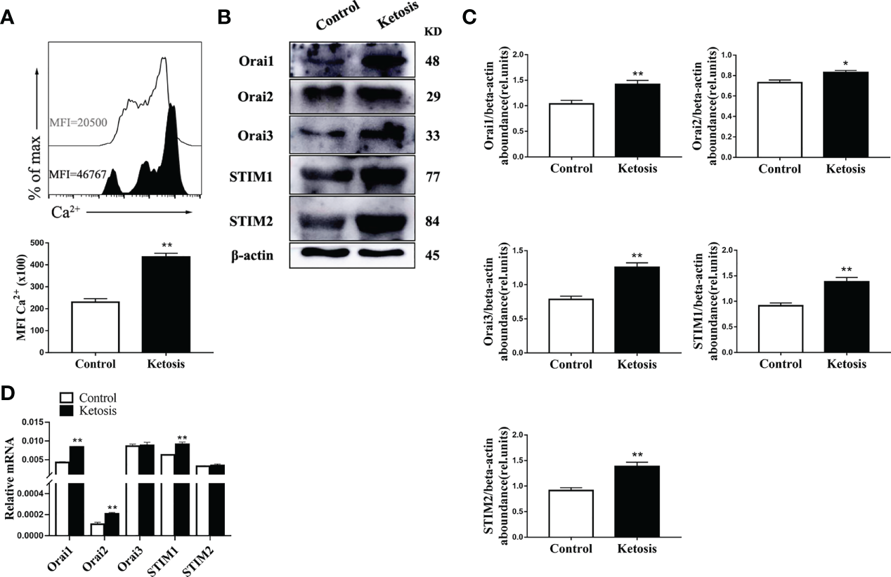 Ketosis increased the levels of Ca2+ and expression of SOCE. (A) Staining of intracellular Ca2+ using Fluo-3A (n = 4 per group). (B) Western blot analysis of SOCE-related protein (n = 6 per group) (C) Relative protein abundance of SOCE (n = 6 per group). (D) ORAI and STIM mRNA expression were measured by qRT-PCR (n = 6 per group). For all bar plots shown, data are expressed as the means ± SEM, *P < 0.05, **P < 0.01 by independent-samples t-test.