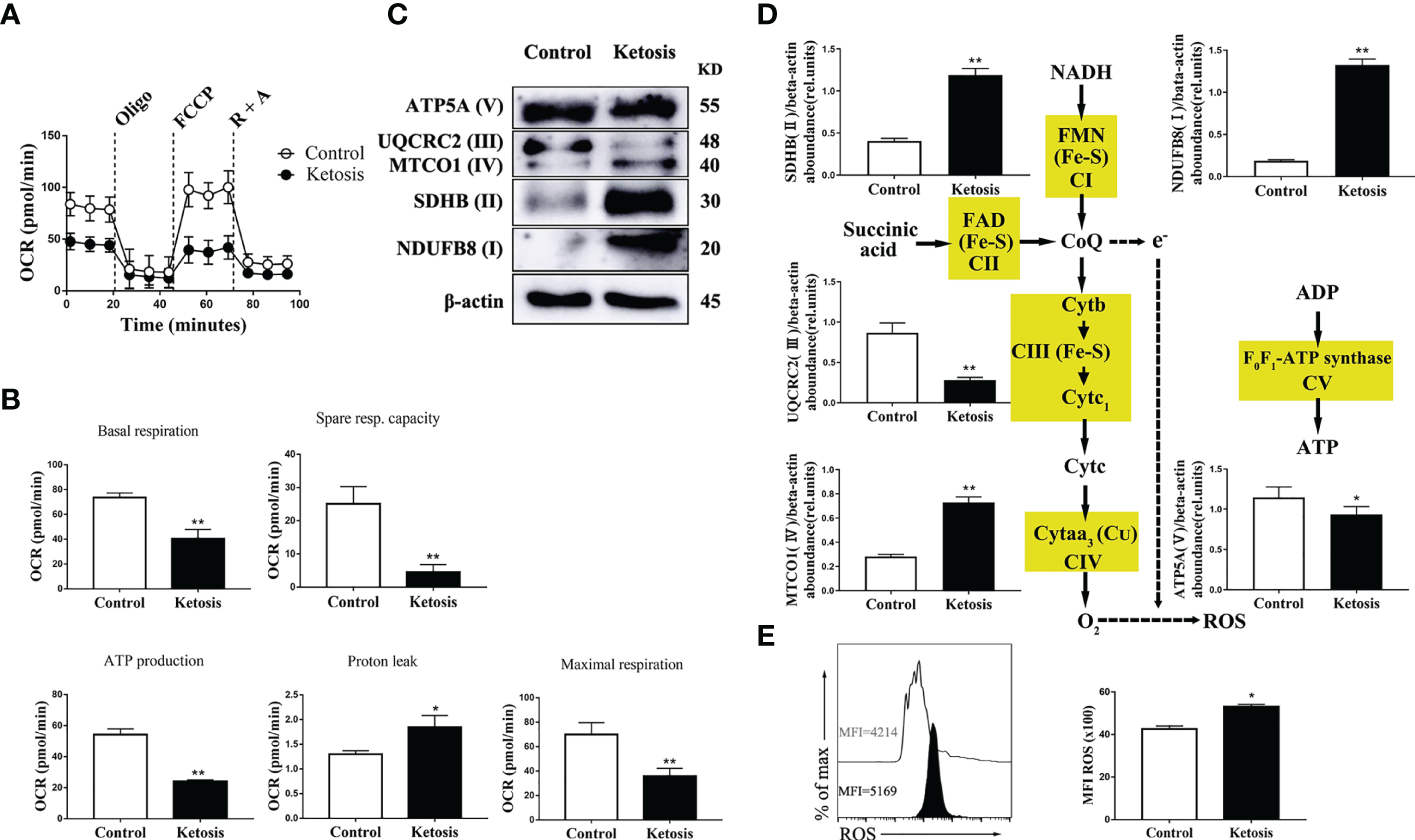 Decreased level of oxidative phosphorylation metabolism following ketosis underlie increased production of ROS in CD4+ T cells. (A–E) CD4+ T cells were sorted from healthy and ketotic cows. (A) Oxygen consumption rates (OCRs) measured by extracellular flux analysis (n = 4 per group). T cells were measured under basal conditions. Oligo, oligomycin; R, rotenone; A, antimycin. (B) Mean (± SEM) of basal and maximal respiration (after FCCP), ATP production, proton leak and spare respiratory capacity from vivo-isolated CD4+ T (n = 4 per group). (C) Western blot analysis of ETC complex proteins in CD4+ T cells from healthy and ketotic cows (n = 6 per group). (D) Relative abundance of ETC complex proteins (n = 6 per group). (E) The level of ROS was analyzed by flow cytometry (n = 6 per group). For all bar plots shown, data are expressed as the means ± SEM, *P < 0.05, **P < 0.01 by independent-samples t-test.