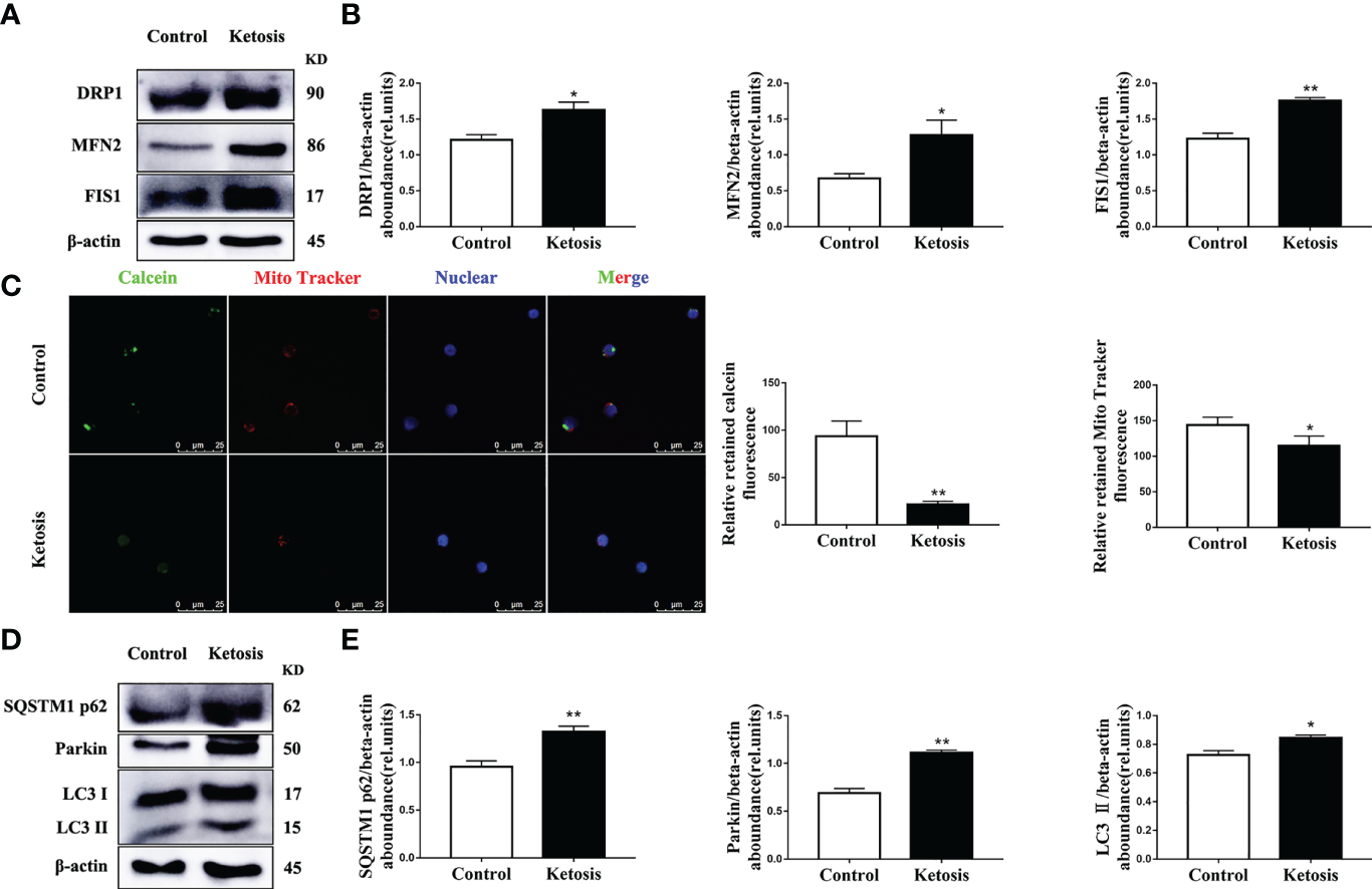 In addition, the abundance of proteins associated with mitochondrial dynamics was upregulated (Figures 4A, B) and mitochondrial membrane permeability downregulated (Figure 4C) in CD4+ T cells from ketotic cows. In terms of mitophagy, the protein abundance of LC3, p62 and Parkin was upregulated in CD4+ T cells from ketotic cows (Figures 4D, E). Together, these findings demonstrated that mitochondrial protein expression and function were impaired, and mitophagy was initiated in CD4+ T cells from ketotic cows.