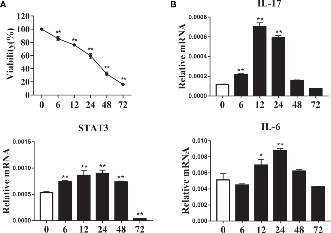 Cell viability was determined with the Cell Counting Kit-8 (Beyotime Biotechnology, Jiangsu, China) according to manufacturer’s instructions. Cells were seeded at 5 × 103 cells/well in 96-well plates using RPMI-1640 basic medium supplemented with 10% FBS, 1% Penstrep, 1% L-Glut and 55 μM β-mercaptoethanol and 1 μg/mL Concanavalin A for 60 h, and incubated at 37°C in 5% CO2. After 60-h culture, cells were maintained in RPMI-1640 basic medium supplemented with 2% BSA and treated with or without 1.2 mM fatty acids for 0, 6, 12, 24, 48, and 72 h. After treatment, 20 µL of CCK-8 solution was added to each well and then incubated in the dark for 1 h at 37°C in 5% CO2. The optical density was measured at 450 nm on a spectrophotometer (Thermo Scientific Instruments Inc.). The experiments were repeated at least three times.