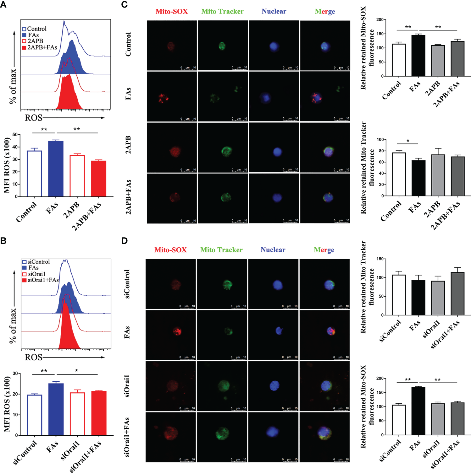 For silencing, 1 × 106 CD4+ T cells (6-well plate) were seeded 24 h before the experiment in antibiotic-free medium. Cells were transfected with 40 pM cattle ORAI1 siRNA (GenePharma, Shanghai, China) and a non-target siRNA using siRNA-mate (GenePharma, Shanghai, China) according to the manufacturer’s protocols. For inhibition, CD4+ T cells were pretreated with 50 mM of the store-operated Ca2+ Channel Inhibitor 2APB (MedChemExpress, Shanghai, China) for 2 h prior to fatty acid challenge. Ten mM of the OXS inhibitor N-Acetylcysteine (NAC, Beyotime Biotechnology, Jiangsu, China), or vehicle (DMSO) was used for 2 h prior to fatty acid challenge.