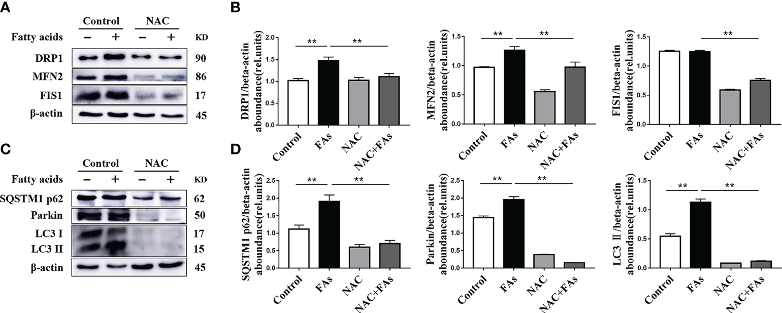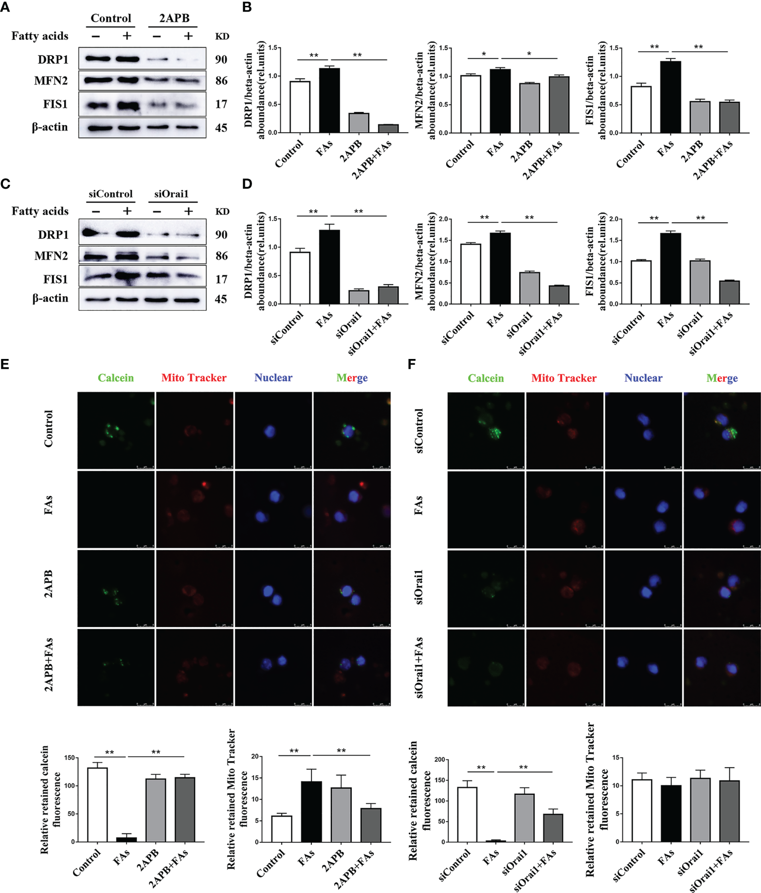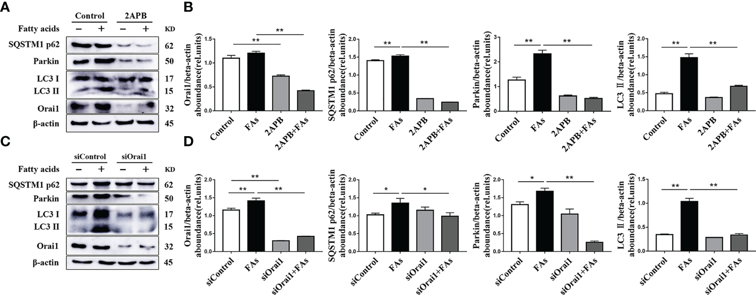 For western blot, after high temperature denaturation treatment, the same amount (30 μg/lane) of the protein sample was placed on a 10% SDS-PAGE for separation. Then, protein bands were transferred to a polyvinylidene difluoride (PVDF) membrane (Millipore Corp., Billerica, MA). The membrane was then blocked for 1 h at room temperature in blocking buffer (0.1% Triton-X/PBS containing 5% skim milk powder). Blocked membranes were incubated overnight at 4°C with specific antibodies for total OXPHOS (1:1000, ab110413; abcam, CA), DRP1 (1:1000, ab154879; abcam, CA), MFN2 (1:1000, 12186-1-AP; ProteinTech), FIS1 (1:1000, 10956-1-AP; ProteinTech), SQSTM1/P62 (1:1000, 18420-1-AP; ProteinTech), Parkin (1:1000, #4221; Cell Signaling, Shanghai), LC3B (1:1000, ab48394; abcam, CA), Orai1 (1:1000, ab175040; abcam, CA), ORAI3 (1:1000, ab25426; abcam, CA), STIM1 (1:1000, ab108994; abcam, CA), STIM2 (1:1000, ab59342; abcam, CA), and β-actin (internal control; 1:1000, sc-47778; Santa Cruz, CA). Subsequently, membranes were incubated with HRP-conjugated secondary antibodies (3:5000; Beyotime) for 1 h at room temperature. Immunoreactive bands were detected using an enhanced chemiluminescence solution (Beyotime). Visualization of target proteins was performed using a ProteinSimple imager (ProteinSimple, San Jose, CA). Image Lab software (Bio-Rad, Hercules, CA) was used to analyze intensity of the bands and compared changes across the different treatments.