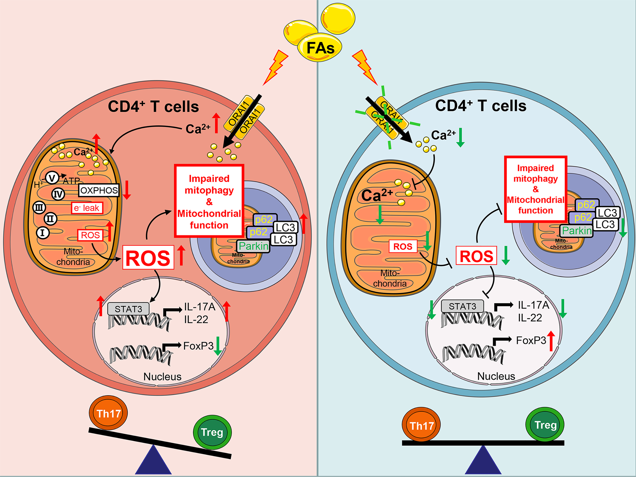 The underlying causes of dysfunctional inflammation during the period around parturition have been the subject of considerable research. However, the role of adaptive immune responses especially at the onset of lactation when the liver is flooded by FA that often lead to ketosis is largely unknown. The mechanisms whereby SOCE regulates the development and function of T cells are also poorly understood. Thus, the main objective of the present study was to investigate the link between high concentrations of FA, ORAI1 and Ca2+ signaling, mitochondrial dysfunction, and the function of T lymphocytes. Clinical ketosis during the first week of lactation provided a physiologically relevant model to study these aspects. In vitro studies with isolated CD4+ T cells allowed for the controlled evaluation of mechanisms at play.
