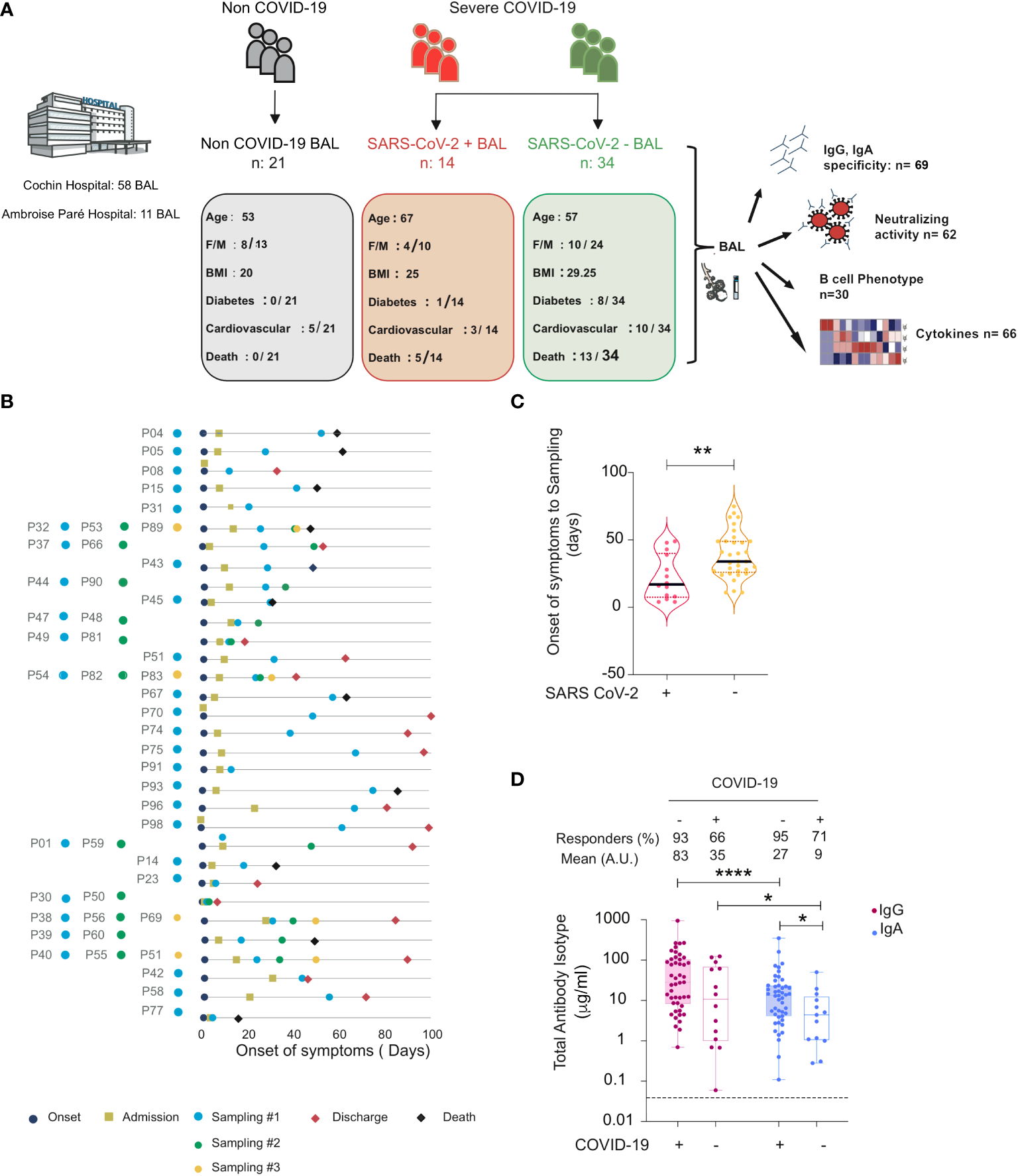 Figure 1 Total and specific IgG and IgA in BAL from SARS-CoV-2-infected and non-infected individuals. (A) Graphical representation showing the overall study design and the characteristics (number, age, body mass index (BMI), sex (F = female, M = male), diabetes, and fatality rates) of the individuals included in the study. Illustration with images from Servier Medical Art, licensed under the Creative Commons Attribution 3.0 Unported License. (B) Timeline of the course of disease for enrolled patients infected with SARS-CoV-2. (C) SARS-CoV-2 containing (SARS-CoV-2+) samples correspond to the early phase, whereas those lacking virus (SARS-CoV-2−) correspond to a late phase of the disease. Violin plots of time from onset of symptoms to sampling for each sample in SARS-CoV-2+ and SARS-CoV-2− BAL. p-Values were calculated by using Mann–Whitney test. (D) Comparison between values of total IgG and IgA (μg/ml) in BAL from SARS-CoV-2-infected individuals (SARS-CoV-2+ and SARS-CoV-2− BAL) and COVID-19 non-infected individuals. p-Values were calculated by using Wilcoxon test: *, p < 0.05; **, p < 0.01; ****, p < 0.0001. Dashed line: cutoff value for antibody detection. Negative values are not shown. BAL for bronchoalveolar lavage.