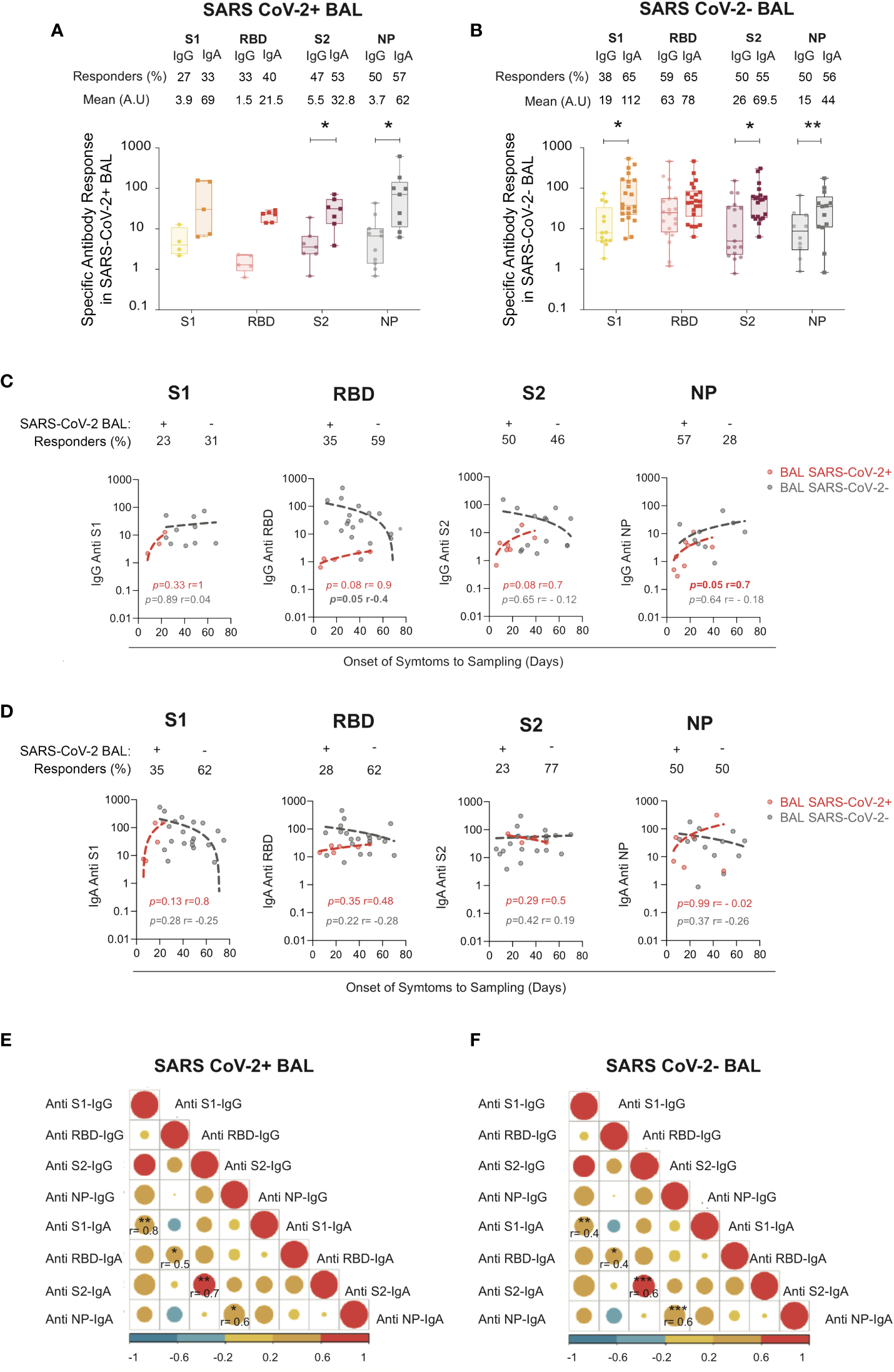 Figure 2 S1-, RBD-, S2-, and NP-specific IgG and IgA in SARS CoV-2+ vs SARS-CoV-2− BAL. (A) S1-, S2-, RBD-, and NP-specific IgG and IgA responses in SARS-CoV-2+ BAL (B) S1-, S2-, RBD-, and NP-specific IgG and IgA responses in SARS-CoV-2− BAL. (A, B) Proportion of specific IgG or IgA over total IgG or IgA measured by ELISA. Specific (OD450)/total IgA or G (μg/ml) are shown. p-Values were calculated by using Mann–Whitney test: *, p < 0.05; **, p < 0.01; ***, p < 0.005. (C) Correlations between specific S1-, RBD-, S2-, and NP-specific IgG antibodies in SARS-CoV-2+ BAL (red dots) and SARS-CoV-2− BAL (gray dots) and onset of symptom to sampling date (days). (D) Correlations between S1-, RBD-, S2-, and NP-specific IgA antibodies SARS-CoV-2+ BAL (red dots) and SARS-CoV-2− BAL (gray dots) and onset of symptom to sampling date (days). (E) Correlation between specific S1, RBD, S2, and NP IgA and IgG antibodies in SARS-CoV-2+ BAL individuals. (F) Correlation between S1-, RBD-, S2-, and NP-specific IgA and IgG in SARS-CoV-2− BAL individuals. All correlations were calculated using Spearman’s test. RBD, receptor-binding domain; NP, nucleocapsid protein.