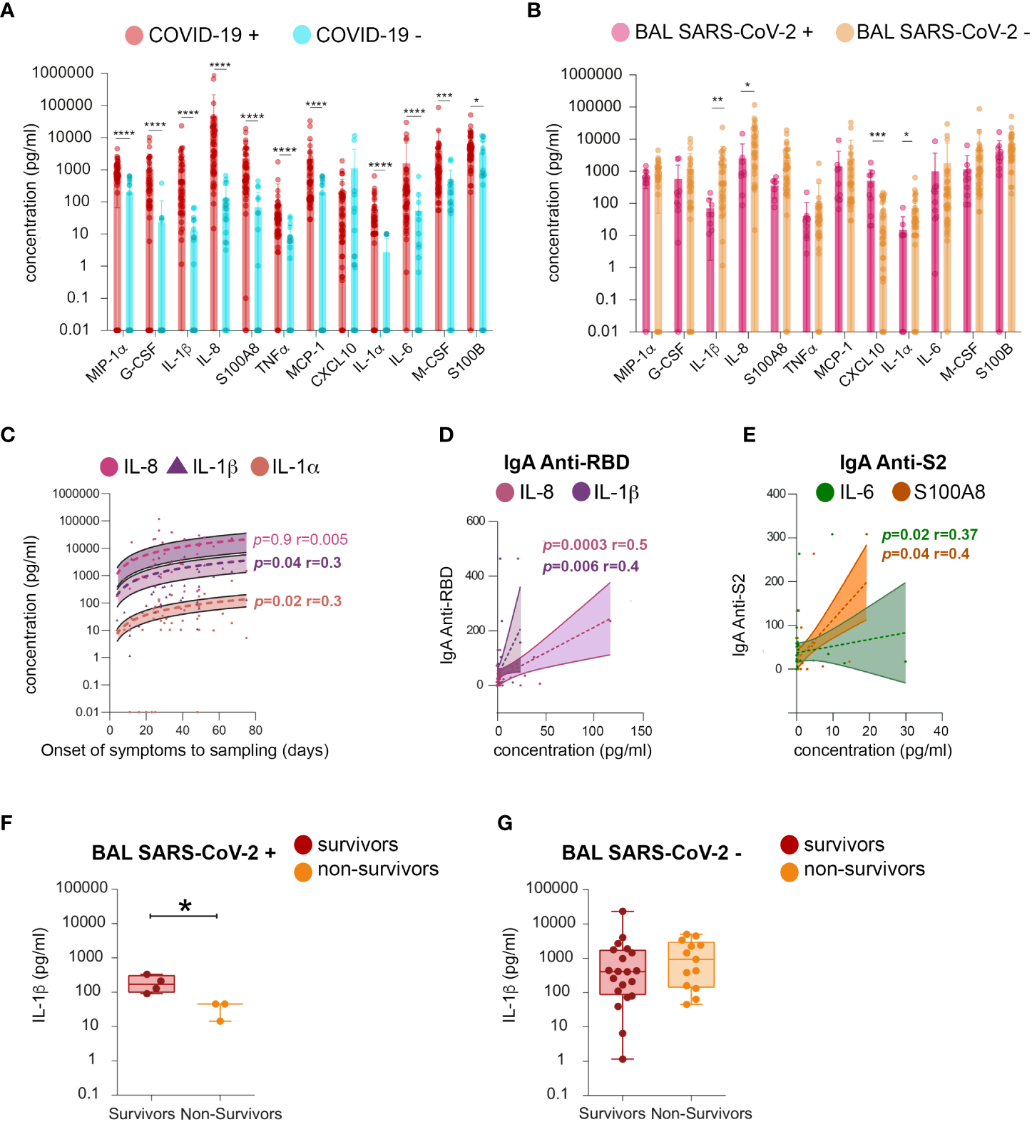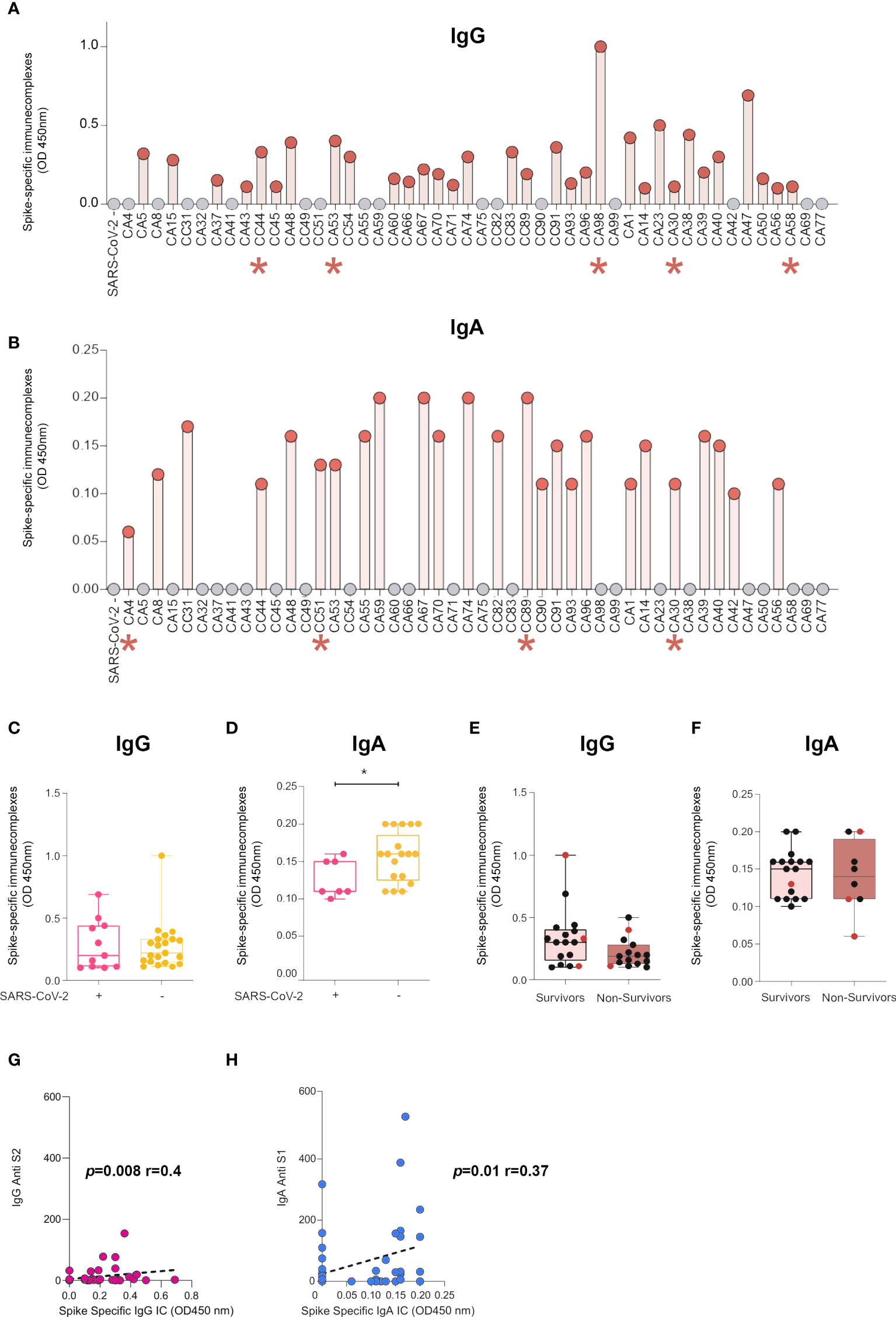 Figure 3 BAL from SARS-CoV-2-infected individuals contain IgG- and IgA-spike immune complexes (ICs). (A) Anti-spike IgG ICs were detected in 32 of the 48 samples analyzed by ELISA. Indicated with a red asterisk are individuals who had undetectable levels of IgG anti-spike/NP antibodies. (B) Anti-spike IgA ICs were detected in 25 of the 48 samples analyzed by ELISA. Indicated with red asterisk are individuals who had undetectable levels of IgA anti-spike/NP antibodies. (C, D) Comparison of presence of ICs made of spike with IgG (c) or IgA (D) in SARS-CoV-2+ BAL individuals and SARS-CoV-2− BAL subjects. p-Values were calculated by using Mann–Whitney test: *, p < 0.05. (E, F) Comparison of presence of ICs made of spike with IgG (E) or IgA (F) in survivors vs non-survivors. (G, H) Correlation between specific S1 and levels of ICs made of spike with IgG (G) or IgA (H). Correlations were calculated using Spearman’s test. BAL, bronchoalveolar lavage; NP, nucleocapsid protein.