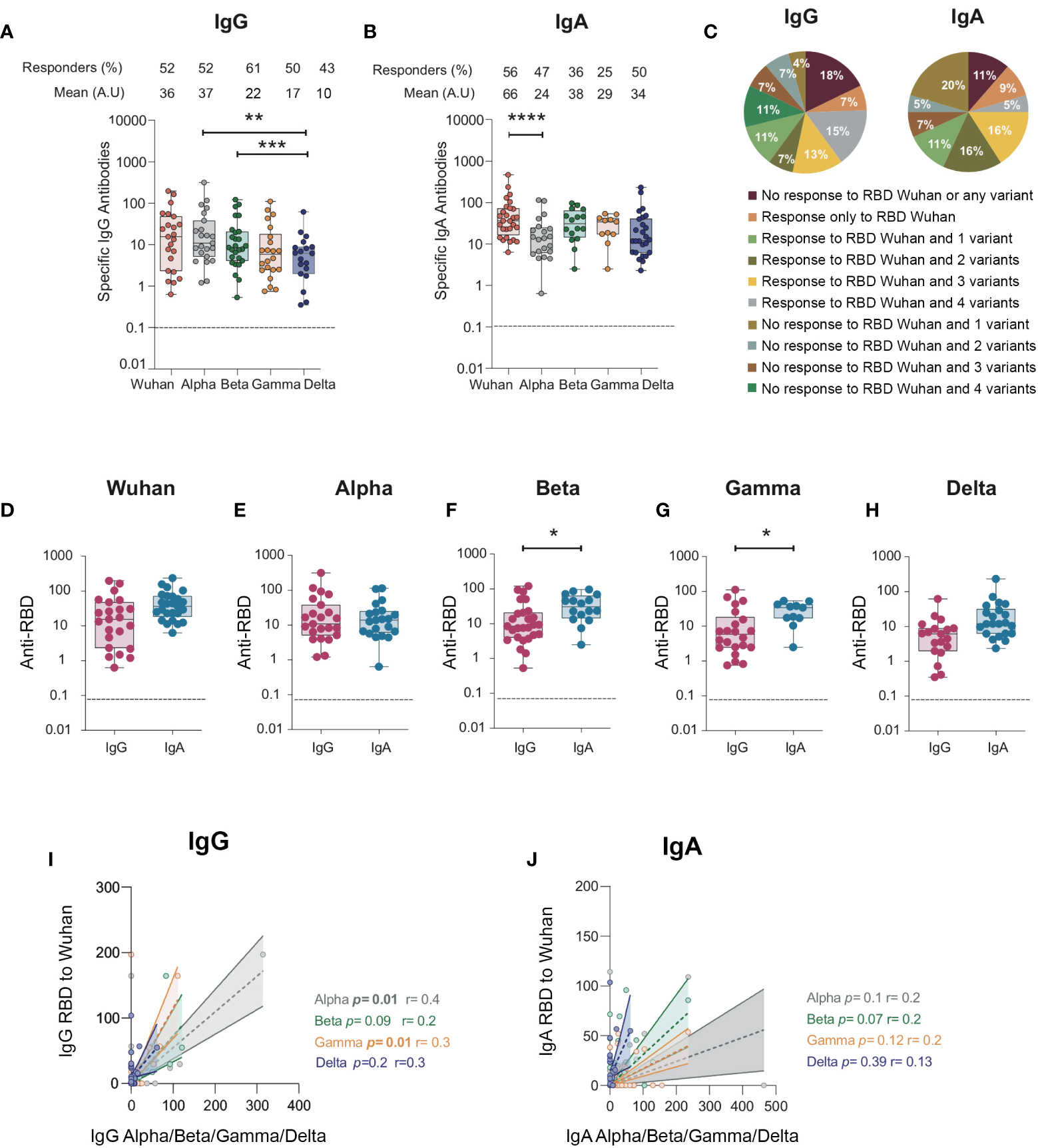 Figure 4 IgG and IgA antibodies from BAL from SARS-CoV-2-infected individuals against RBD protein from SARS-CoV-2 Alpha (B.1.1.7), Beta (B.1.351), Gamma (P.1), and Delta (B.1.617) variants. (A) Specific IgG responses against Alpha, Beta, Gamma, and Delta RBD in BAL from SARS-CoV-2-infected individuals. (B) Specific IgA responses against Alpha, Beta, Gamma, and Delta RBD in BAL from SARS-CoV-2-infected individuals. (A, B) Proportion of specific IgG or IgA over total IgG or IgA measured by ELISA (specific (OD450)/total IgA or G (μg/ml)) are shown. (C) Pie charts showing the percentages of the different responses of IgG (left) and IgA (right) to Wuhan RBD and the different variants. (D–H) Comparison between specific IgG and IgA responses detected against the RBD from ancestral Wuhan strain (D), Alpha (E), Beta (F), and Gamma (G)and Delta (H) variants. Correlation between IgG (I) and IgA (J) specific to Wuhan RBD and IgG and IgA antibodies specific for Alpha, Beta and Gamma variants. Correlations were calculated using Spearman’s test. p-Values were calculated by using Wilcoxon test. *, p < 0.05; **, p < 0.01; ***, p < 0.005, ****, p < 0.0001. Dashed line: cutoff value for antibody detection. BAL, bronchoalveolar lavage; RBD, receptor-binding domain.