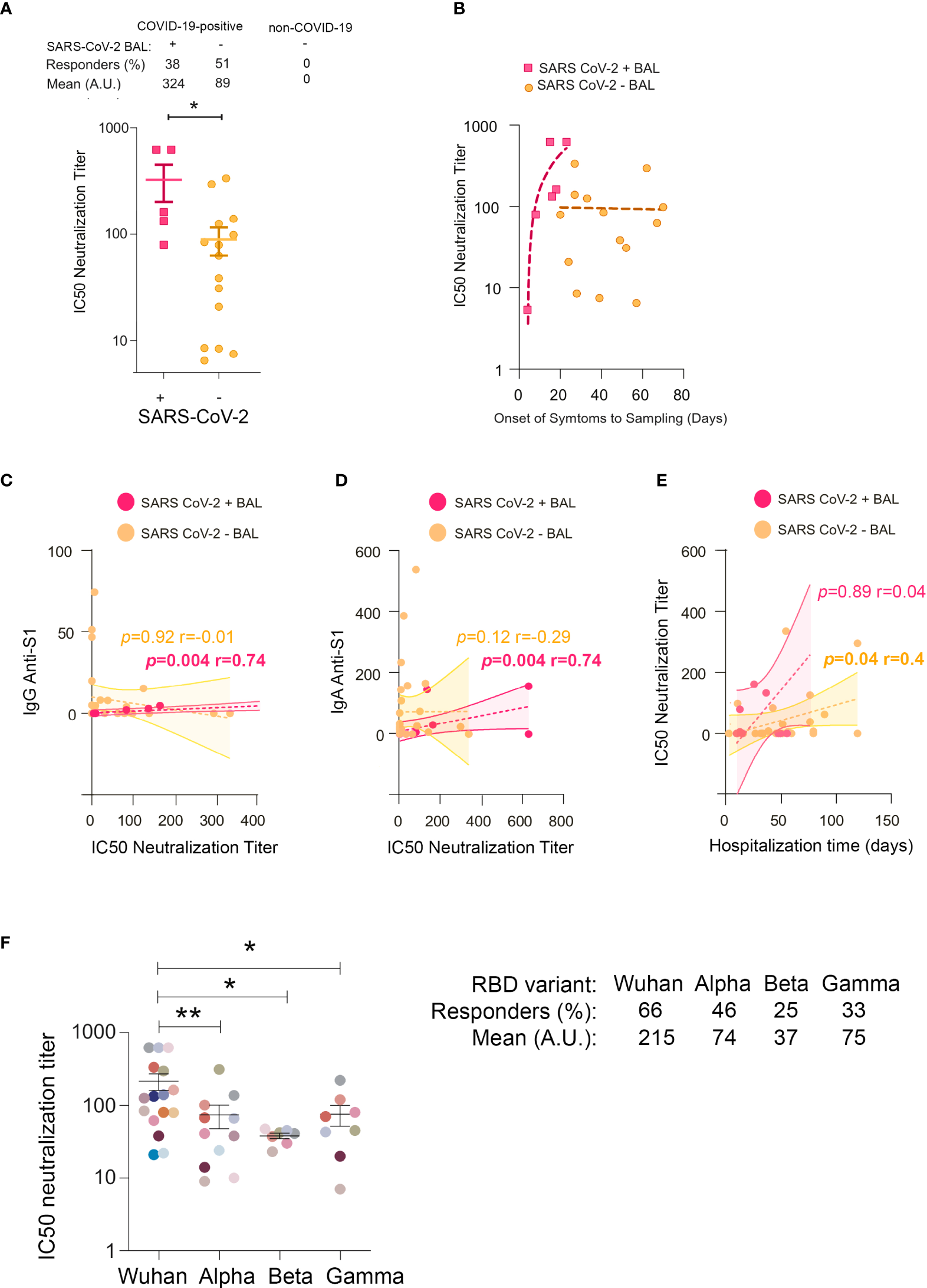 Figure 5 IC50 neutralization titers in BAL from COVID-19 individuals. (A) Comparison of IC50 neutralization titers between SARS-CoV-2+ BAL and SARS-CoV-2− BAL samples. (B) Correlations between IC50 neutralization titers and the onset of symptoms to sampling date in SARS-CoV-2+ BAL (light blue squares) and SARS-CoV-2− BAL (purple dots) individuals. (C) Correlation between IC50 neutralization titers and spike-specific IgG in SARS-CoV-2+ and SARS-CoV-2− BAL. (D) Correlation between IC50 neutralization titers and spike-specific IgA in SARS-CoV-2+ and SARS-CoV-2− BAL. (E) Correlation between neutralization activity and hospitalization time in SARS-CoV-2+ and SARS-CoV-2− BAL. (F) IC50 neutralization titers of BAL from SARS-CoV-2+ individuals against ancestral Wuhan, and Alpha, Beta, and Gamma SARS-CoV-2 variants. A specific color is associated with each individual. All correlations were calculated using Spearman’s test. p-Values were calculated by using Mann–Whitney test. *, p < 0.05; **, p < 0.01. BAL, bronchoalveolar lavage.