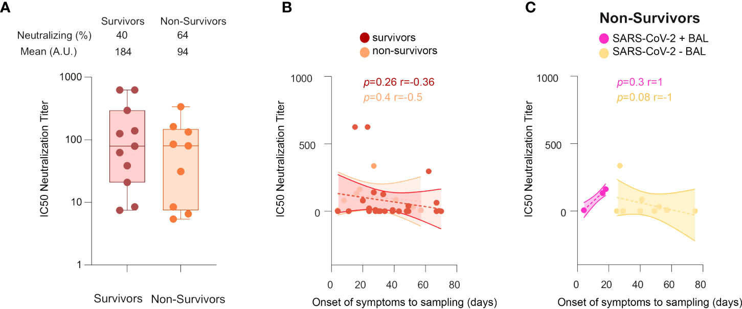 Figure 7 Neutralization activities in COVID-19+ survivors vs non-survivors. (A) Comparison between IC50 neutralization titers between survivors and non-survivors. (B) Cross-sectional representation of neutralizing antibodies in survivors vs non-survivors, shown as correlation between IC50 neutralization titters and time from symptom onset to sampling date in survivors and non-survivors. (C) Cross-sectional representation of neutralizing antibodies in non-survivors, shown as correlation between IC50 neutralization titters and time from symptom onset to sampling date, in SARS-CoV-2+ BAL and SARS-CoV-2− BAL individuals. All correlations were calculated using Spearman’s test. p-Values were calculated by using Wilcoxon test. BAL: bronchoalveolar lavage.