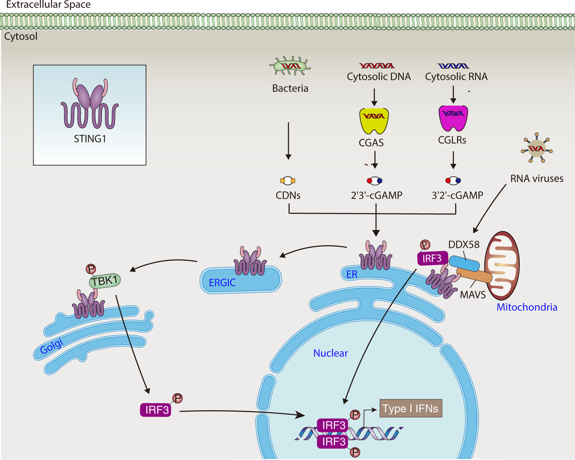 STING1 is a multifaceted protein, probably known best as an adaptor protein of DNA sensor pathways to activate innate immunity. Under normal conditions, most of STING1 is in the ER and acts as a regulator of ER homeostasis. Upon challenge with a range of environmental stresses, STING1 translocates to other organelles, such as Golgi, mitochondria, endosomes, lysosomes, and nuclei, and plays an immune-dependent and -independent role in infection, cell death, and gene expression. Although the subcellular localization sequence of STING1 is unclear, the transport of STING1 in subcellular organelles is regulated by the cytoskeleton, binding proteins, and posttranslational modifications.
