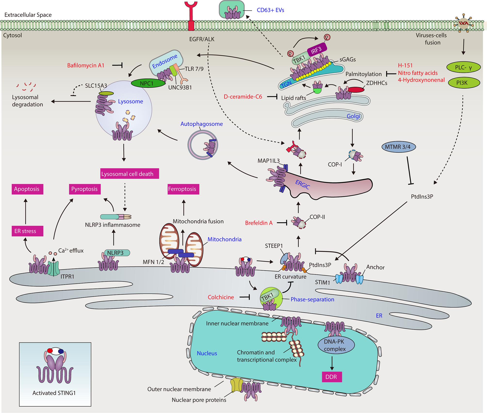 The network of STING1 in different organelles. Activated STING1 traffics to the ER, ERGIC, Golgi, mitochondria, endosomes, lysosomes, and nucleus, contributing to different cellular processes, including immune response, ER stress, cell death, autophagy, gene transcription, and DNA damage response. ALK, ALK receptor tyrosine kinase; Ca2+, calcium; COP-I, coat protein complex I; COP-II, coat protein complex II; DDR, DNA damage response; DNA-PK, DNA-dependent protein kinase; EGFR, epidermal growth factor receptor; ER, endoplasmic reticulum; ERGIC, endoplasmic reticulum-Golgi intermediate compartment; EV, extracellular vesicle; IRF3, interferon regulatory factor 3; ITPR1, inositol 1,4,5-trisphosphate receptor type 1; MAP1LC3, microtubule-associated protein 1 light chain 3; MFN 1/2, mitofusin 1/2; MTMR3/4, myotubularin-related protein 3/4; NLRP3, NLR family pyrin domain containing 3; NPC1, Niemann-Pick type C1; PI3K, phosphatidylinositol-3 kinase; PLC-γ, phospholipase C-γ; PtdIns3P, phosphatidylinositol-3-phosphate; sGAG, sulfated glycosaminoglycan; SLC15A3, solute carrier family 15 member 3; STING1, Stimulator of interferon response CGAMP interactor 1; STIM1, stromal interaction molecule 1; STEEP1, STING1 ER exit protein 1; TBK1, TANK binding kinase 1; TGN, trans-Golgi network; TLR, toll-like receptor; type I IFN, type I interferon; UNC93B1, unc-93 homolog B1, TLR signaling regulator; ZDHHC, zinc finger dhhc-type palmitoyltransferase.