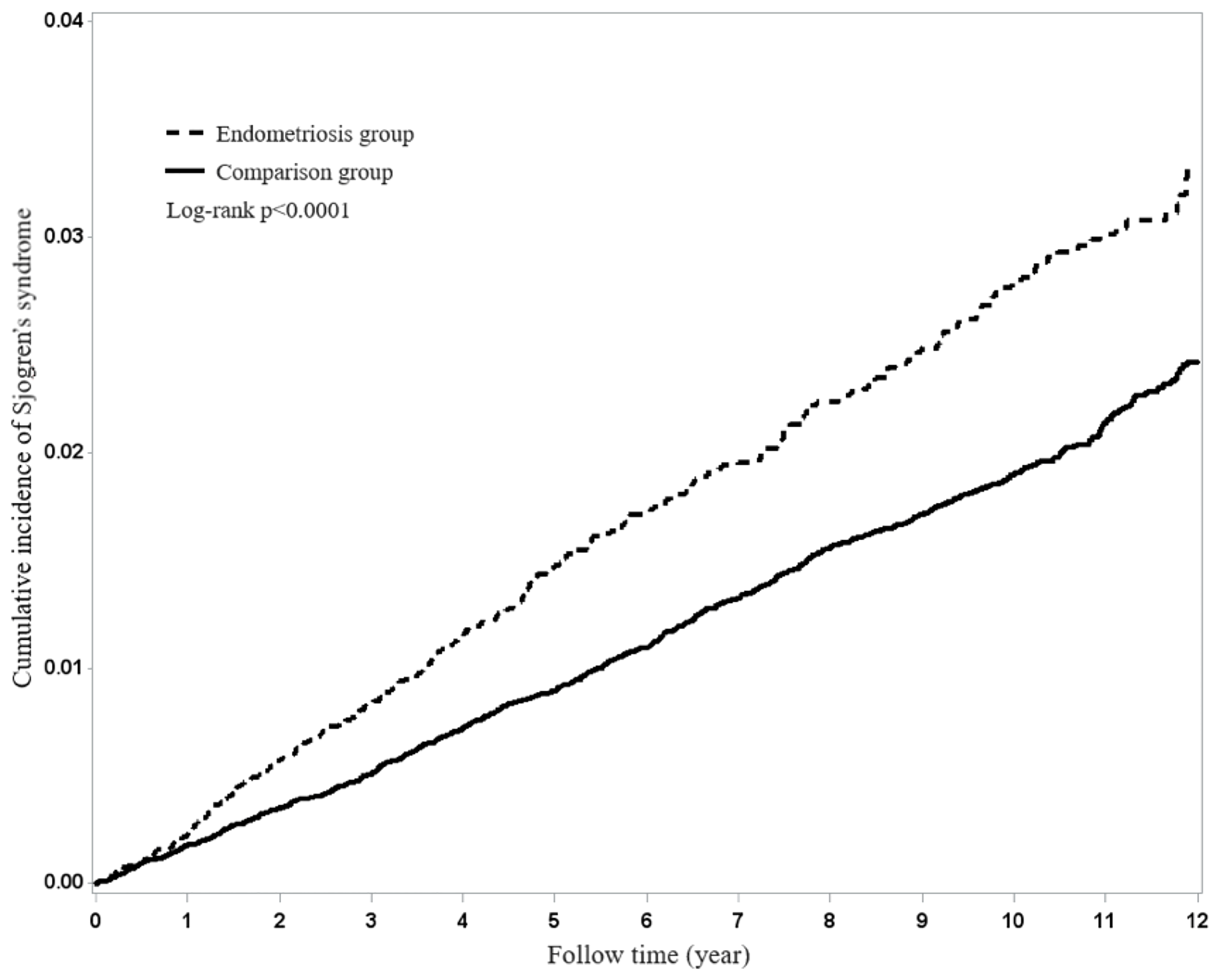 A total of 73,665 individuals were included in this study. We identified 14733 newly diagnosed endometriosis patients and 58,932 non-endometriosis comparison group. The adjusted hazard ratio (HR) for incidental Sjögren’s syndrome was 1.45 (95% confidence interval CI=1.27-1.65) in the endometriosis group, compared to the non-endometriosis comparison group. In subgroup analysis, the adjusted HR was 1.53 (95% CI=1.25-1.88) in the age group of 20-39 and 1.41 (95% CI =1.18-1.68) in the age of 40-64. Time-vary analysis showed that endometriosis who have a follow-up time of fewer than five years (adjusted HR=1.57, 95% CI=1.32-1.87) have a significantly highest risk of having subsequent Sjögren’s syndrome.