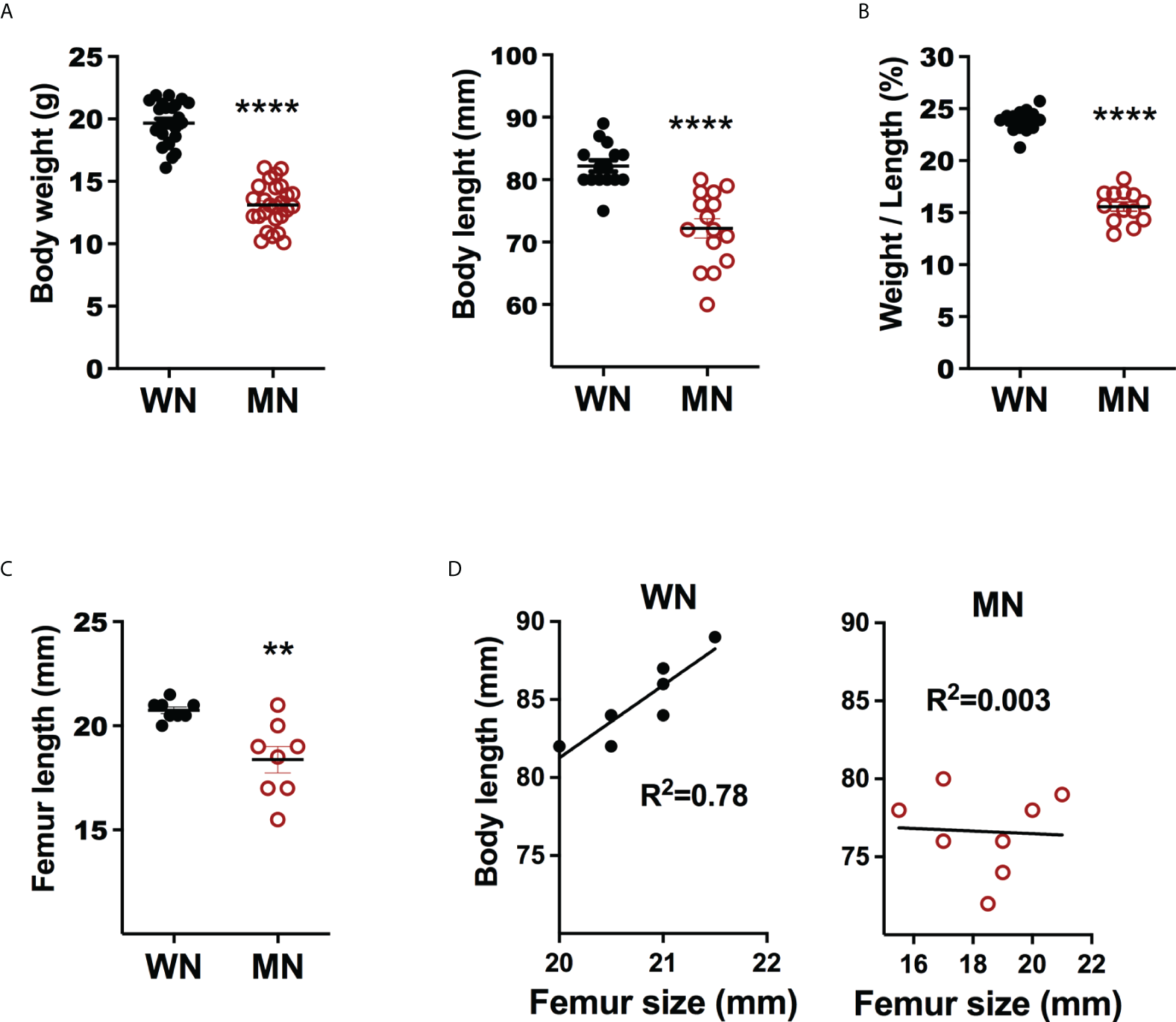 We evaluated the effect of moderate acute malnutrition (diet deficient in protein, iron, and zinc) on body weight and length, and bone length. As we demonstrated previously, the malnourished mice had a flat growth curve so that when the control mice reached a mature weight 28 days after weaning to a normal diet, the malnourished (MN) mice had approximately 30% less body weight and a 15% reduction in body length (Figure 1A). The disproportionately reduced weight over length (Figure 1B) is characteristic of acute malnutrition. Malnourished mice also showed significant reductions in the length of the femur (Figure 1C). Body length and femur length were strongly correlated in control mice but not in malnourished mice (Figure 1D). This suggests that bone health may be uniquely impacted by acute malnutrition.