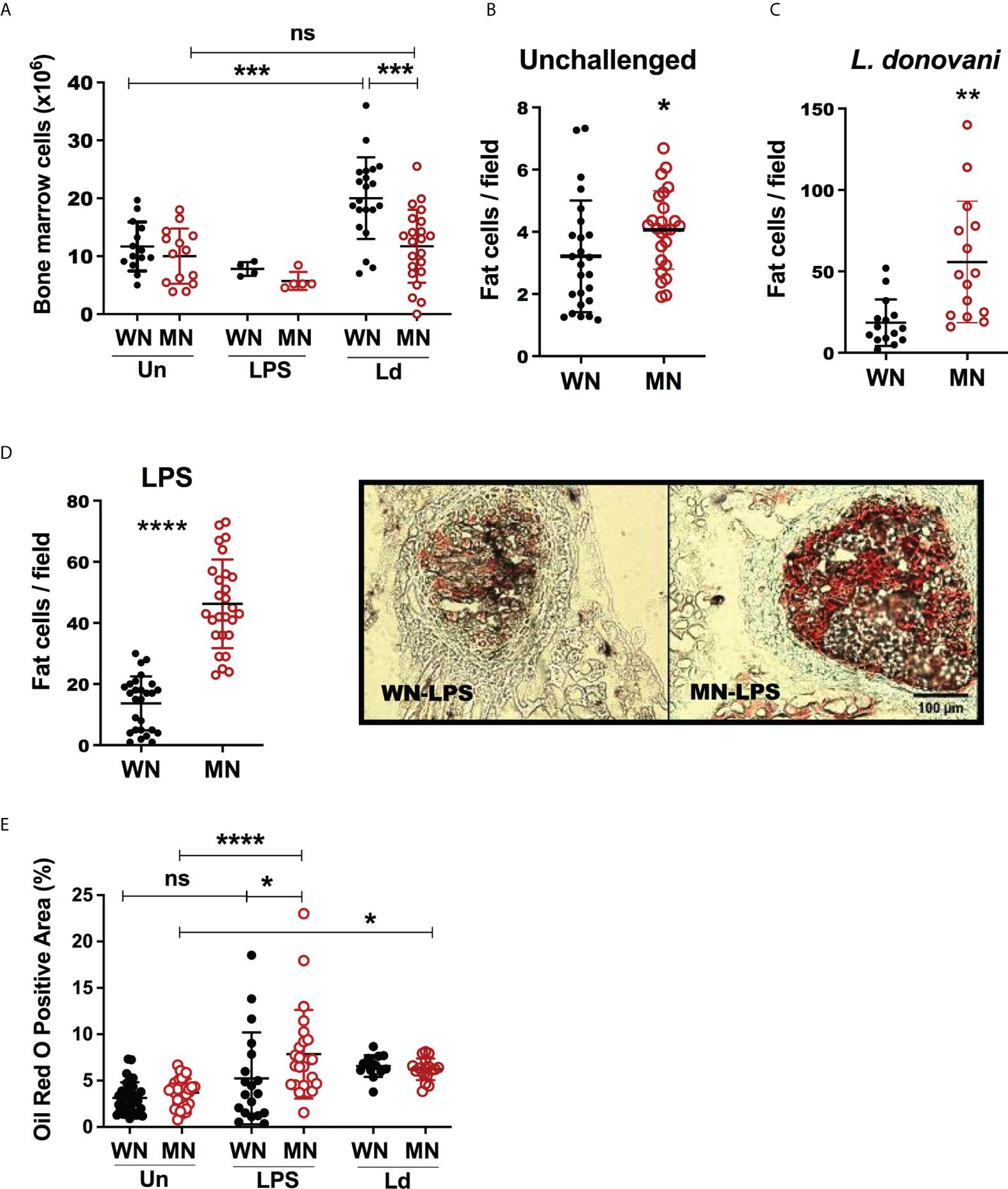 Malnutrition leads to increased bone marrow adiposity. Well-nourished (WN) or malnourished (MN) mice were challenged with lipopolysaccharide (LPS) or L. donovani (Ld) and compared with naïve unchallenged (Un) mice. L. donovani-challenged mice were evaluated at 72h post-challenge and LPS-challenged mice were evaluated at 24h post-challenge. (A) Number of cells in bone marrow from femur enumerated by microscopy. (B) Number of lipid-filled Oil-Red O positive (Oil-red O+) cells in sternum cryosections from uninfected mice. (C) Number of cells Oil-Red O positive (Oil-red O+) in sternum cryosections from L. donovani challenged mice at 72h post-challenge. (D) Left panel: Number of Oil-Red O+ bone marrow cells per field in sternum cryosections from LPS-challenged mice. Right panel: image showing Oil-red O+ cells in hematopoietic centers observed in sternum cryosections from LPS challenged mice. (E) Oil-Red O+ area (hematopoietic centers + bone areas) in sternum cryosections. N=5 mice per group, 2 experiments. *p<0.05, **p<0.01, ***p<0.001, ****p<0.0001. ns, not significant.
