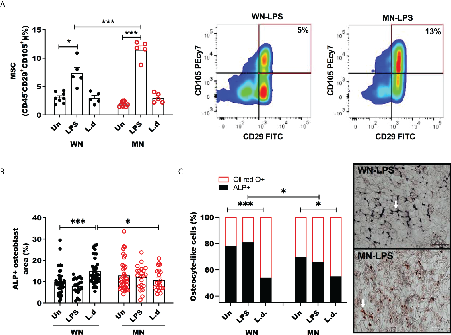Mesenchymal stem cells are increased but osteoblasts unchanged in LPS challenged malnourished mice. Well-nourished (WN) or malnourished (MN) mice were challenged with LPS or L. donovani (Ld) and compared with naïve unchallenged (Un) mice. L. donovani-challenged mice were evaluated at 72h post-challenge and LPS-challenged mice were evaluated at 24h post-challenge. (A) Percentage of bone marrow mesenchymal cells (MSC) (CD45-CD29+CD115+) relative to total bone marrow cells and representative plot by flow cytometry (gated as S Figure 1). (B) Percentage of alkaline phosphatase positive area (ALP+) to identify osteoblasts in sternum cryosections. (C) Proportion of osteocyte-like cells in trabecular bone stained with Oil-Red O (Oil-red O +) or alkaline phosphatase (ALP+) in sternum cryosections. Right: Image showing osteocyte-like cells (white arrow) in trabecular bone double-stained with Oil-red O (red: lipid+) and alkaline-phosphatase (ALP+) (black: osteocyte), in sternum cryosections from LPS challenged mice. N=5 mice per group, 2 experiments.*p<0.05, ***p<0.001.
