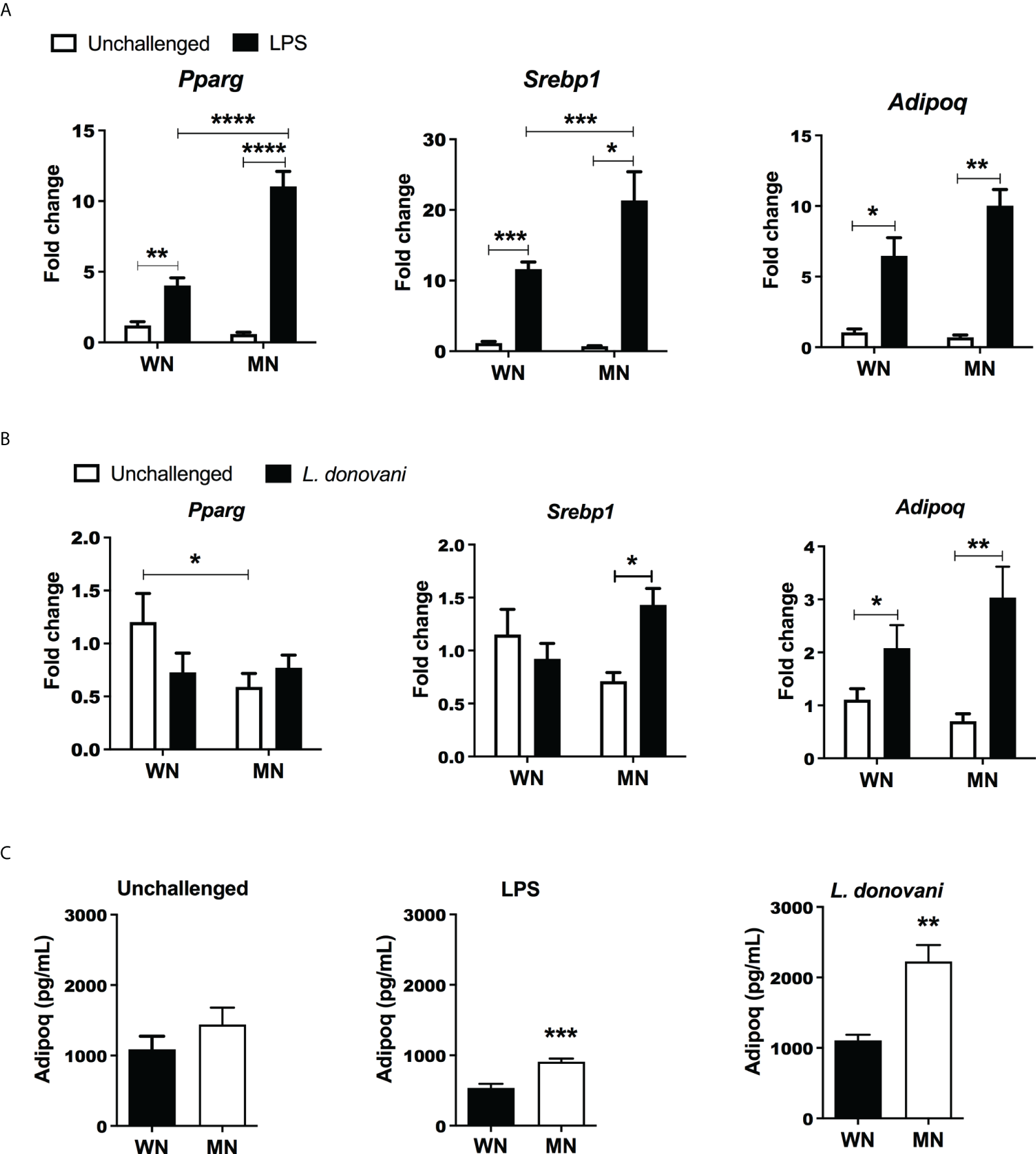 Since the increase in MSCs was paralleled by increased cellular lipid content, we considered that MSC may be driven to differentiate toward adipocytes. In support of this, we found that the BM from mice challenged with LPS showed increased expression of genes involved in adipogenesis, peroxisome proliferator-activated receptor gamma (Pparg), sterol regulatory element-binding protein 1 (Srebp1), Adiponectin (Adipoq) compared to unchallenged mice (Figure 4A). Following LPS challenge the increased expression of genes Pparg and Srebp1 was amplified in MN mice compared to well-nourished (WN) mice (Figure 4A). L. donovani challenge followed a similar trend but a synergistic effect of malnutrition and L. donovani challenge was not significant (Figure 4B). We also found that the Bone marrow production of the adipokine, adiponectin, was also increased in both LPS- and L. donovani-challenged MN mice (Figure 4C).