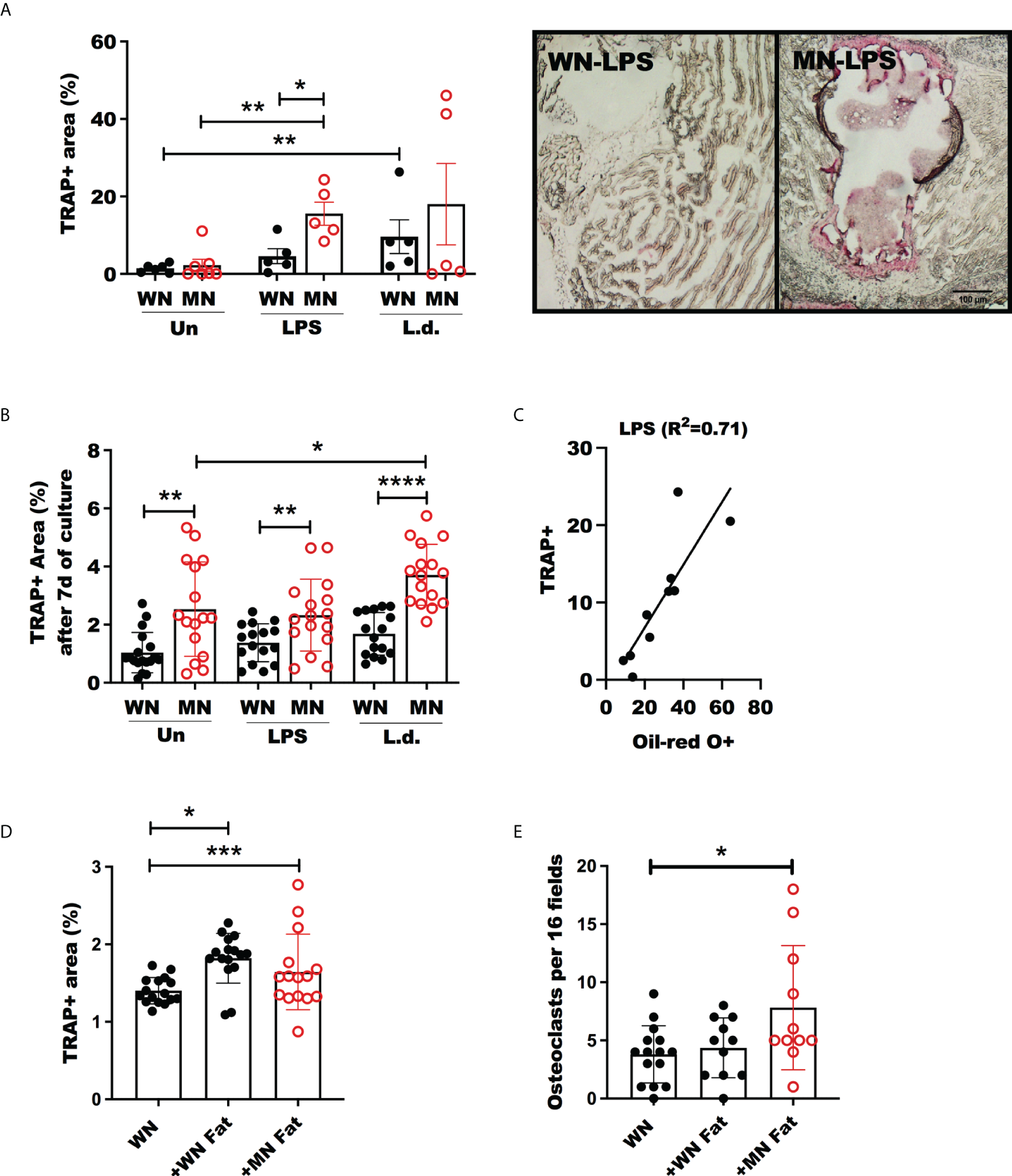 Increased Osteoclast activity in malnourished mice following inflammatory challenge. Well-nourished (WN) or malnourished mice (MN) remained naive unchallenged (Un) or were challenged with LPS or L. donovani (Ld). (A) Osteoclast activity measured by tartrate resistant acid phosphastase (TRAP) positive area in sternum cryosections and image showing TRAP staining (pink areas) of sternum cryosections from LPS challenged mice (same magnification for both panels). n=5 mice per groug, 2 experiments. (B) Percentage of area occupied by TRAP+ osteoclasts from femur bone marrow differentiated ex vivo with m-Csf and Rankl with or without exposure to LPS or L. donovani antigens (L.d.). (C) Linear correlation and correlation coefficient (R2) of TRAP+ area vs. oil-red-O+ area in sternum cryosections of LPS-challenged mice. (D, E) Percentage of area occupied by TRAP+ osteoclasts and number of osteoclasts per field from bone marrow femur of well-nourished mice (WN) differentiated with ex vivo with M-CSF and RANKL with or without exposure to 6mg/mL fat homogenate from well-nourished (+WN fat) or from malnourished mice (+MN fat). Number of multinucleated osteoclasts by Methyl green staining. Representative of 2 experimets with cells pooled from 2-3 mice/group. *p<0.05, **p<0.01, ***p<0.001, ****p<0.0001.