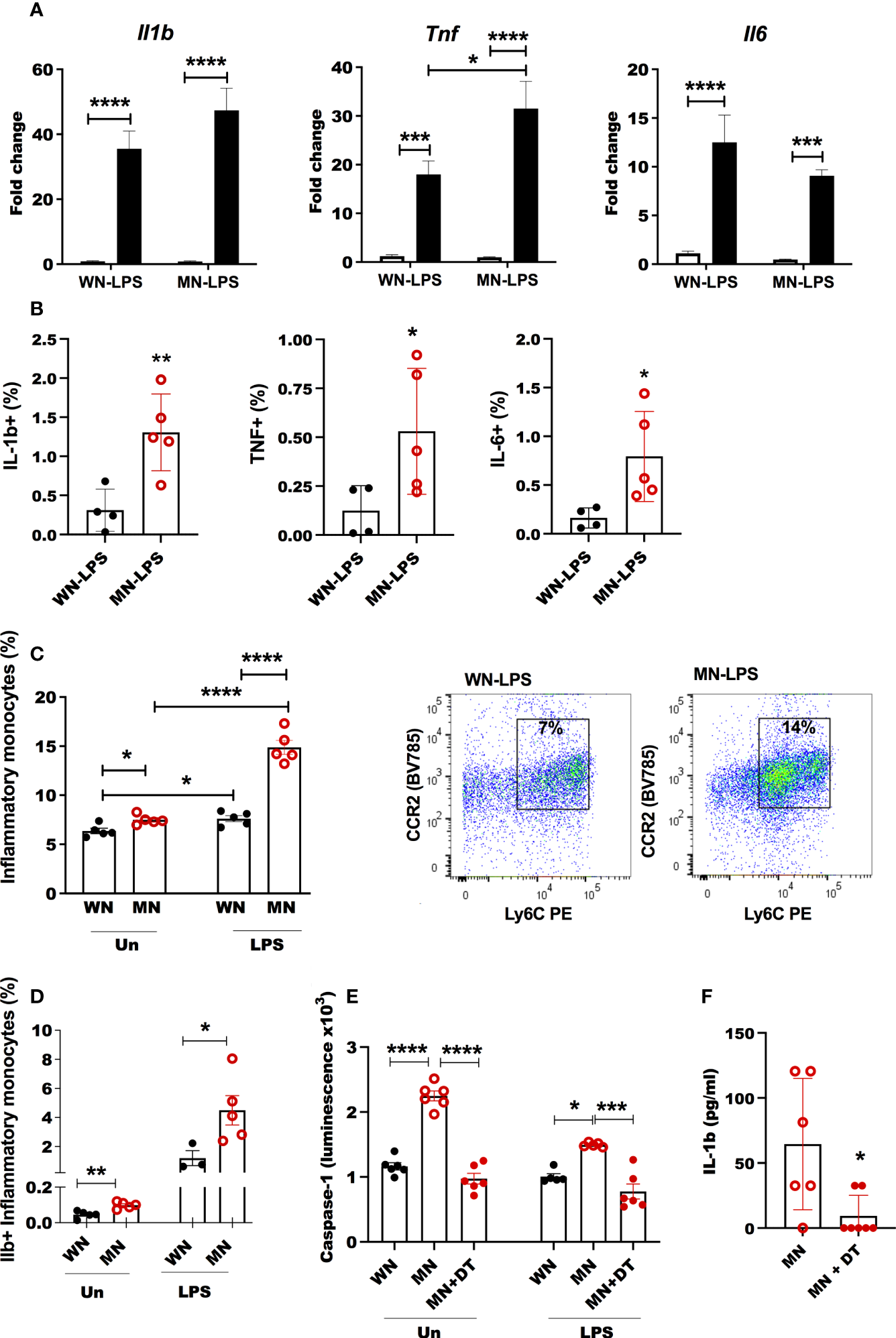 Heightened inflammatory response in bone marrow of malnourished mice following inflammatory challenge. (A) Expression of inflammatory cytokines interleukin-1β (Il-1b), tumor necrosis factor (Tnf) and interleukin-6 (Il6) in bone marrow of well-nourished (WN) or malnourished (MN) mice that were naïve unchallenged (Un) or challenged with LPS. Bone marrow was obtained 24h after LPS challenge and expression (fold change) relative to unchallenged WN mice, determined by qRT-PCR. (B) Percentage of IL-1ß, TNF and IL-6 in inflammatory monocytes in LPS challenged mice by flow cytometry. (C) Percentage of inflammatory monocytes (CD11b+Ly6Cint/hi Ly6G-CD11c-) relative to total bone marrow cells in well-nourished (WN) or malnourished (MN) mice that were naïve unchallenged (Un) or challenged with LPS or L. donovani (L.d.) determined by flow cytometry. Right: representative dot-plot showing inflammatory monocytes (CCR2+Ly6Chi/int) in LPS challenged mice, (gated as Supplementary Figure 1E). (D) Proportion of inflammatory monocytes containing Il-1ß naïve unchallenged (Un) or challenged mice with LPS by flow cytometry. (E) Inflammasome activation in bone marrow cells from Csfr1-LysMcre-DT malnourished (MN) mice treated or not with diphtheria toxin (+DT) to deplete inflammatory monocytes, compared with Csfr1-LysMcre-DT well-nourished mice (WN) after 1h of in vitro exposure to LPS or left unchallenged (Un); determined by luminometry with Caspase Glo-1 inflammasome assay. (F) Active Il-1ß in the bone marrow of Csfr1-LysMcre-DT malnourished (MN) mice challenged with LPS treated or not with diphtheria toxin (+DT) to deplete inflammatory monocytes. Determined by luminex. N=5 mice per group, 2 experiments. *p<0.05, **p<0.01, ***p<0.001, ****p<0.0001.