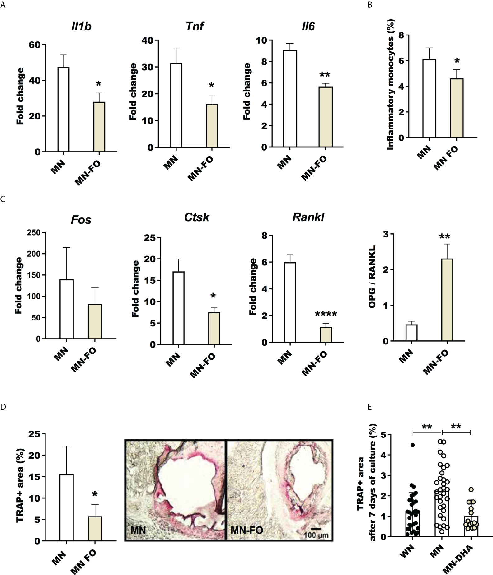 Fish oil supplementation decreases inflammation and osteoclast activation in malnourished mice following inflammatory challenge. Malnourished were mice fed with the standard nutrient deficient diet containing corn oil (MN) or with a nutrient deficient diet in which the corn oil was replaced by fish oil (MN-FO). Both groups of mice were challenged with LPS and the bone marrow isolated 24 hrs later. (A) Expression of interleukin-1β (Il1b), tumor necrosis factor (Tnf) and interleukin-6 (Il6) in bone marrow. Determined by qRT-PCR and expressed as the fold-change over unchallenged mice from the same group. (B) Percentage of inflammatory monocytes (CD11b+Ly6Cint/hi Ly6G-CD11c-) relative to total bone marrow cells determined by flow cytometry (gated as shown in Supplementary Figure 1E). (C) Expression of genes associated with osteoclastogenesis, Fos, Ctsk and Rankl, and ratio of the expression of Opg/Rankl in the bone marrow. (D) Percentage of area occupied by tartrate-resistant acid phosphatase positive (TRAP+) in sternum cryosections image of a TRAP+ field in the bone marrow (pink area). (E) Percentage of area occupied by TRAP+ osteoclasts after 7 days of differentiation of bone marrow cells from LPS challenged mice, treated ex vivo with the omega-3 fatty acid Docosahexaenoic acid (MN-DHA) or vehicle (MN) and compared with those from well-nourished mice (WN). N=5 mice per group, 2 experiments. *p<0.05, **p<0.01.