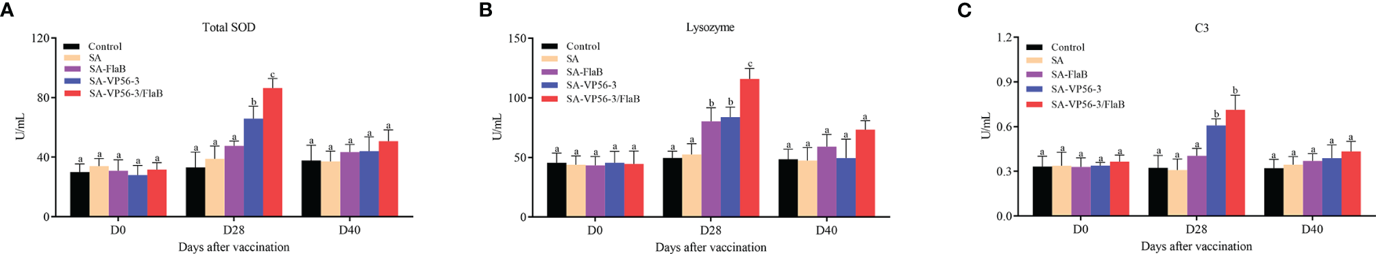 Effect of SA-VP56-3/FlaB on nonspecific immune parameters. (A) Serum TSOD activity. (B) Serum LZM activity. (C) Serum C3 activity, determined on D0, D28, D40. Data are expressed as mean ± SD (n = 4). Different lowercase letters in each group (a, b and c) denote significant variations suggested by the Kruskal-Wallis statistics followed by the Dunn's multiple comparison (p < 0.05).