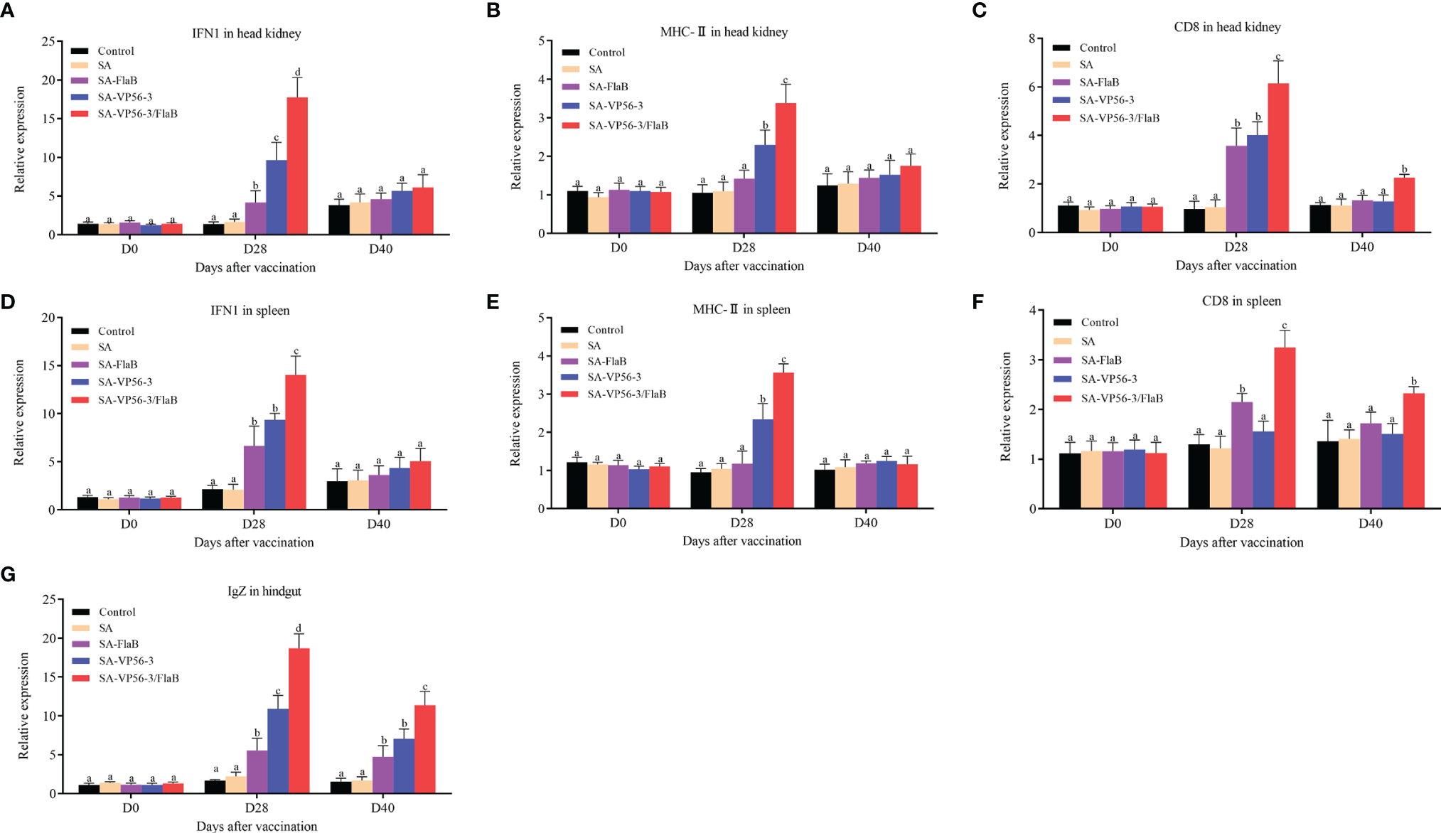 We detected the head kidney and spleen immune-related genes (IFN1, CD8, MHC-II) and hindgut IgZ genes by qRT-PCR after oral immunization and viral challenge. The results showed that the expression levels of IFN1, CD8, MHC-II, and IgZ mRNA in the SA-VP56-3/FlaB group were significantly upregulated on D28, which was significantly different compared with the other groups (Figures 6A–G). On D40, the expression levels of IFN1 and MHC-II gene mRNA converged to normal levels, while CD8 and IgZ mRNA expression in the SA-VP56-3/FlaB group remained at a high level and were significantly different from the other groups (Figures 6A–G). These results suggested that SA-VP56-3/FlaB can effectively induce specific immune responses in grass carp.