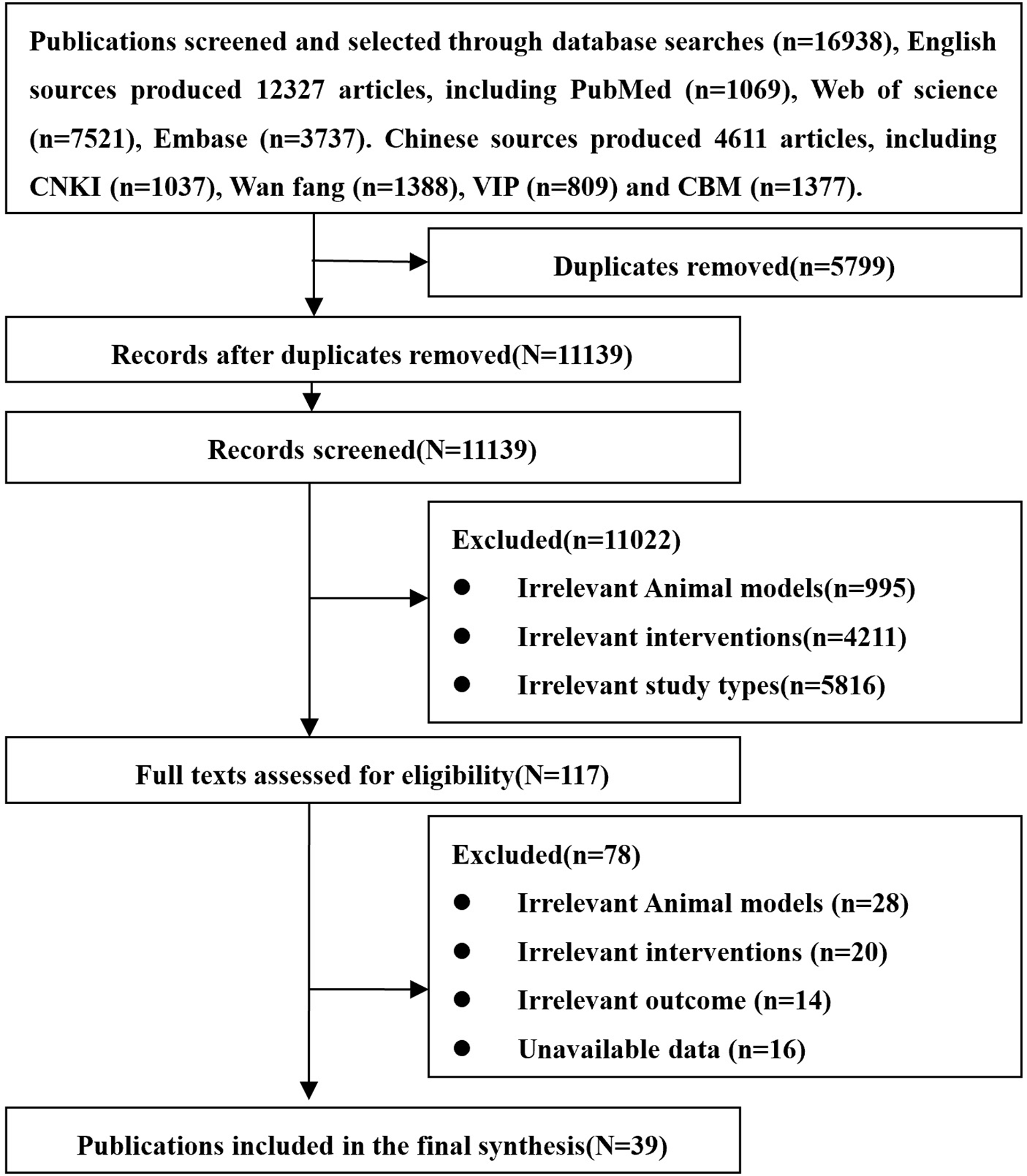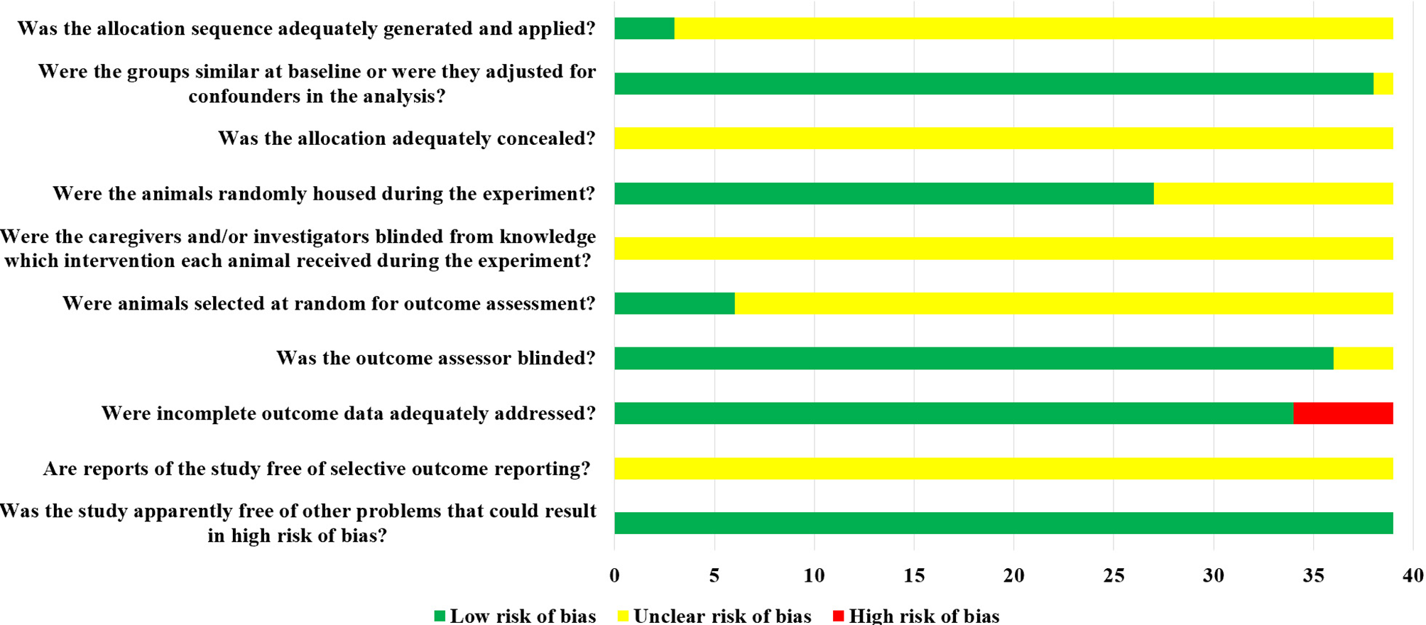 Of the 39 studies included, 38 were randomized controlled experiences, of which only 3 studies described specific randomized grouping methods but did not specify whether covert groupings were implemented. One study reported only the species of animals, which made it impossible to judge whether its baseline characteristics were balanced. The remaining 38 studies clearly reported the baseline characteristics of animals. Among them, 27 studies randomized the placement of animals during the experiment. Due to limited information provided by the included studies, we were unable to determine whether or not blinding of animal breeders and/or researchers was performed. Only 6 studies showed that animals were randomly selected to measure the results. Among them, 36 studies blinded the evaluators of the results. There were 5 studies in which animals died during the experiment. Although no research protocols were available for any of the studies, all expected results were clearly reported. The risk of bias assessment for all studies is detailed in Figure 4.