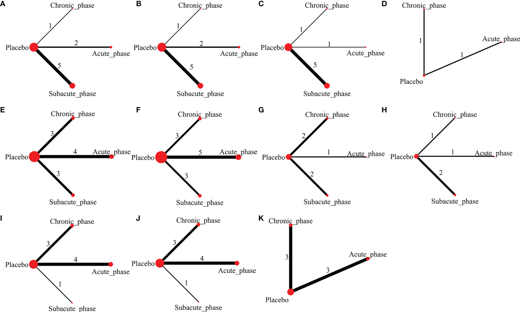 Figure 5 Evidence network plots of moderate injury. (A–D, results of 1, 3, 5, and 8 weeks of high-dose group; E–H, results of 1, 3, 5, and 8 weeks of moderate-dose group; I–K, results of 1, 3, and 5 weeks of low-dose group).