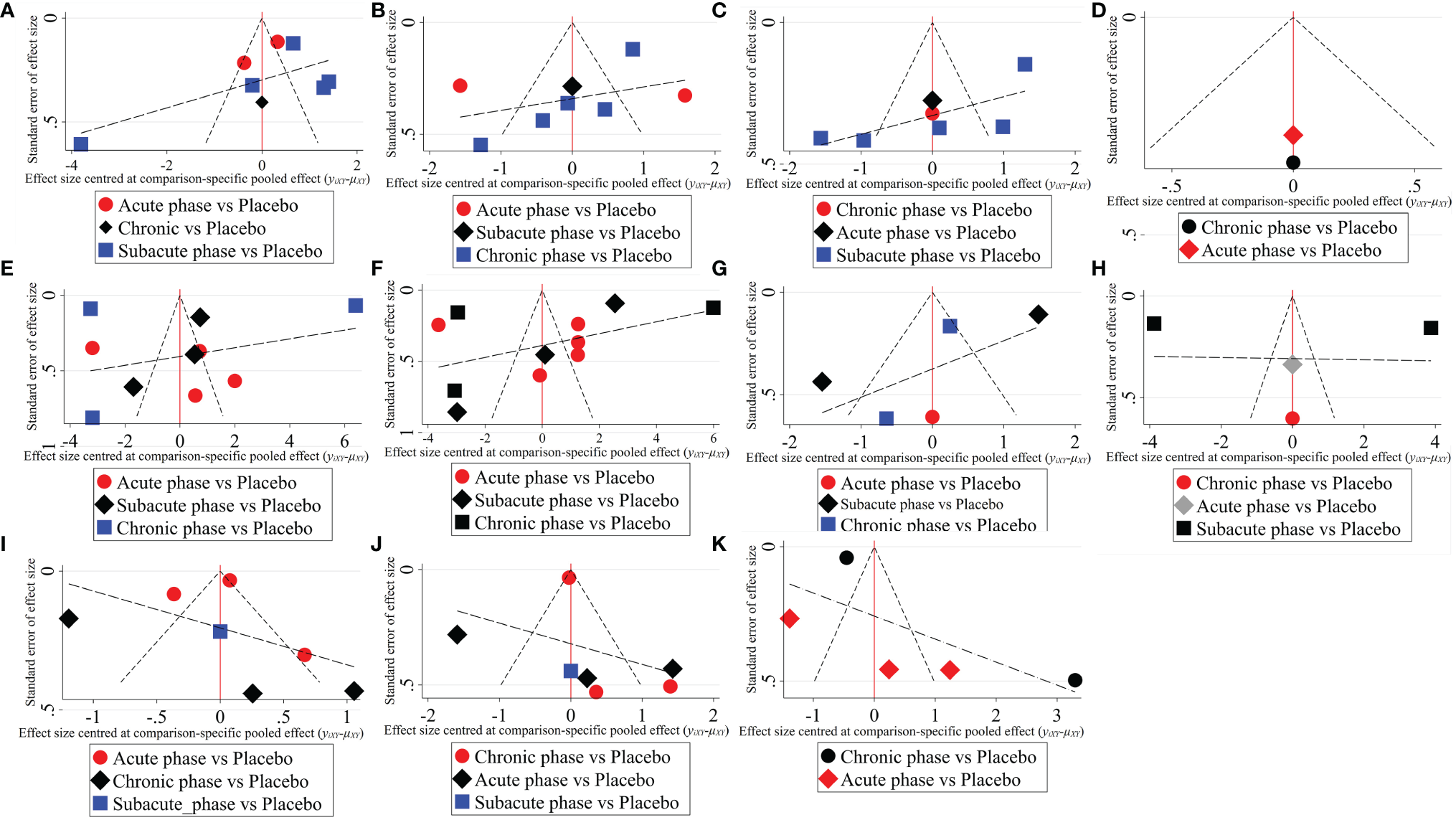Figure 6 The comparison-corrected funnel plots of moderate injury. (A–D, results of 1, 3, 5, and 8 weeks of high-dose group; E–H, results of 1, 3, 5, and 8 weeks of moderate-dose group; I–K: results of 1, 3, and 5 weeks of low-dose group).